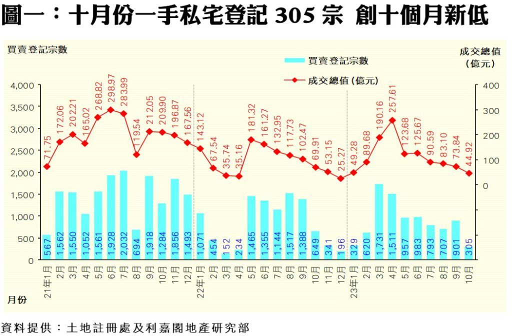 利嘉閣地產研究部主管陳海潮表示,市場端視《施政報告》如何調整樓市辣招,一度令一手新盤銷售幾近冰封,創下年內新低紀錄,惟減辣成真,後市料在低基數下有較顯著反彈。綜合土地註冊處數據所得,2023年十月全港共錄305宗一手私人住宅買賣登記,較九月的901宗大跌66%,創今年以來的10個月低位。十月份登記總值亦因而相應急挫39%,僅錄得44.92億元,除連跌4個月外,亦為近10個月最少。