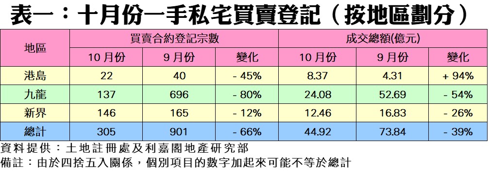 港島區方面,因應息口居高不下,加上十月初起,市場開始觀望及等待《施政報告》減辣內容,發展商亦紛紛暫停推出全新盤,僅剩貨尾零星銷售;總結十月份港島區一手買賣登記量按月大減45%,只錄得22宗,較前月的40宗減少18宗。不過,雖然登記量大跌,惟月內買賣登記金額卻背馳造好,激增94%,錄得8.37億元,主因是月內港島區錄得5宗逾億元的大額豪宅登記所帶動。
