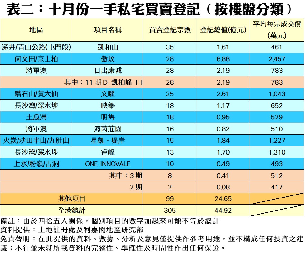 按樓盤分類(見表二),屯門凱和山於十月份錄得35宗登記,成為月內登記量最多的一手私宅項目,登記總值達1.61億元,平均每宗登記約461萬元;其次為何文田的傲玟及日出康城的凱柏峰III,兩者雙雙錄得28宗登記。至於排行榜內上月平均每宗買賣成交價最高者為傲玟的2,457萬元;而粉嶺ONE INNOVALE 2期的417萬元則為較低平均價者。