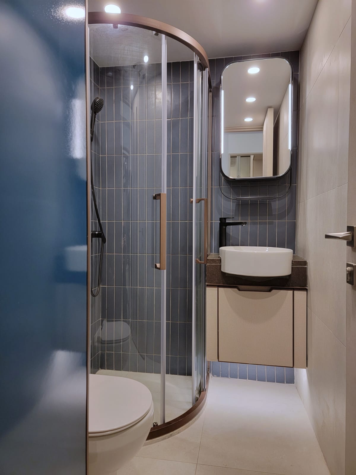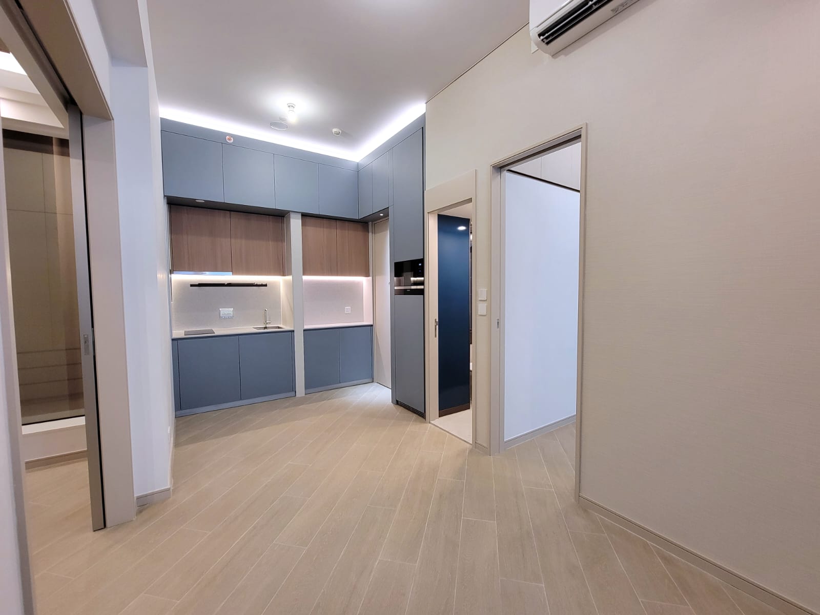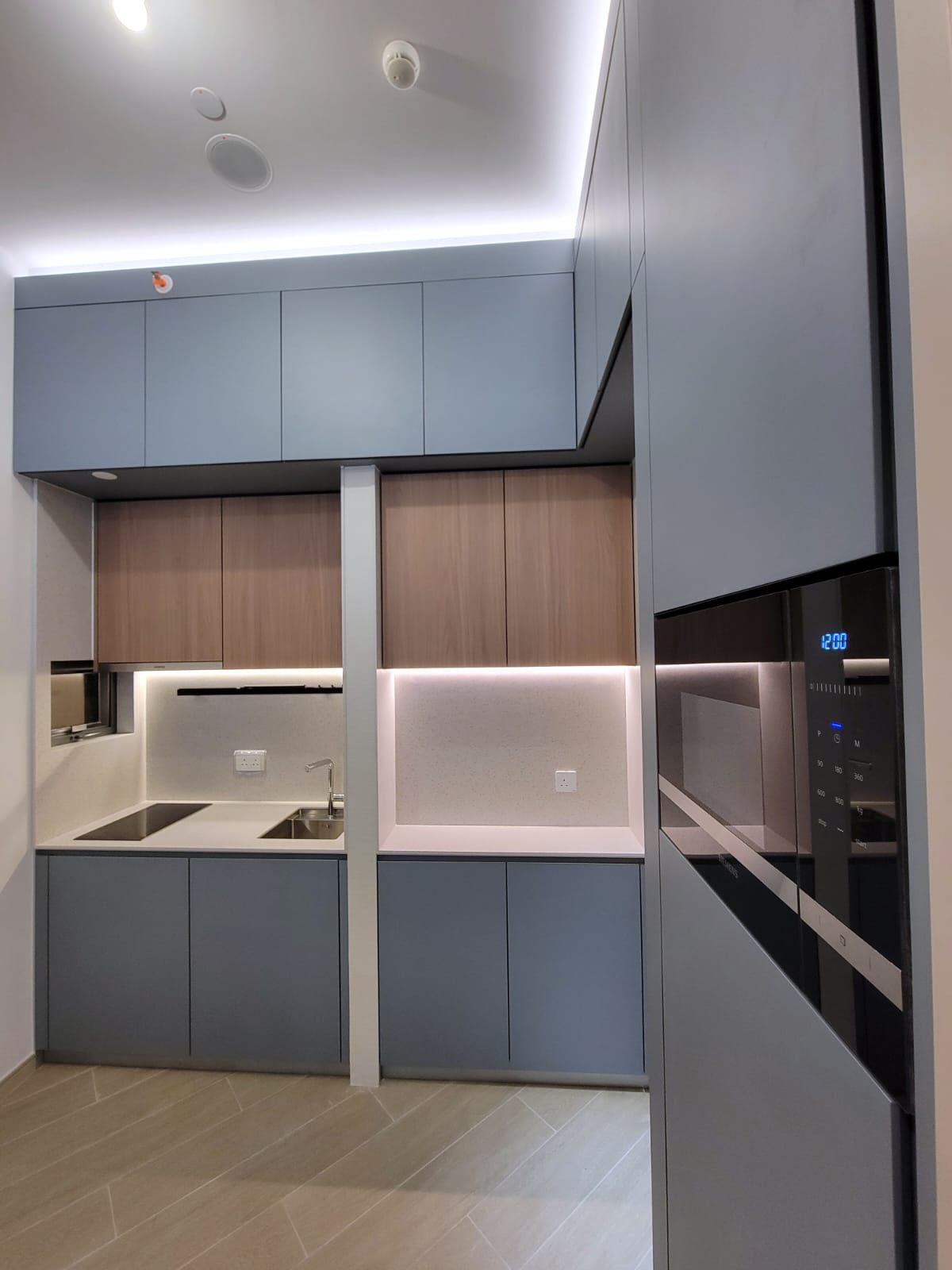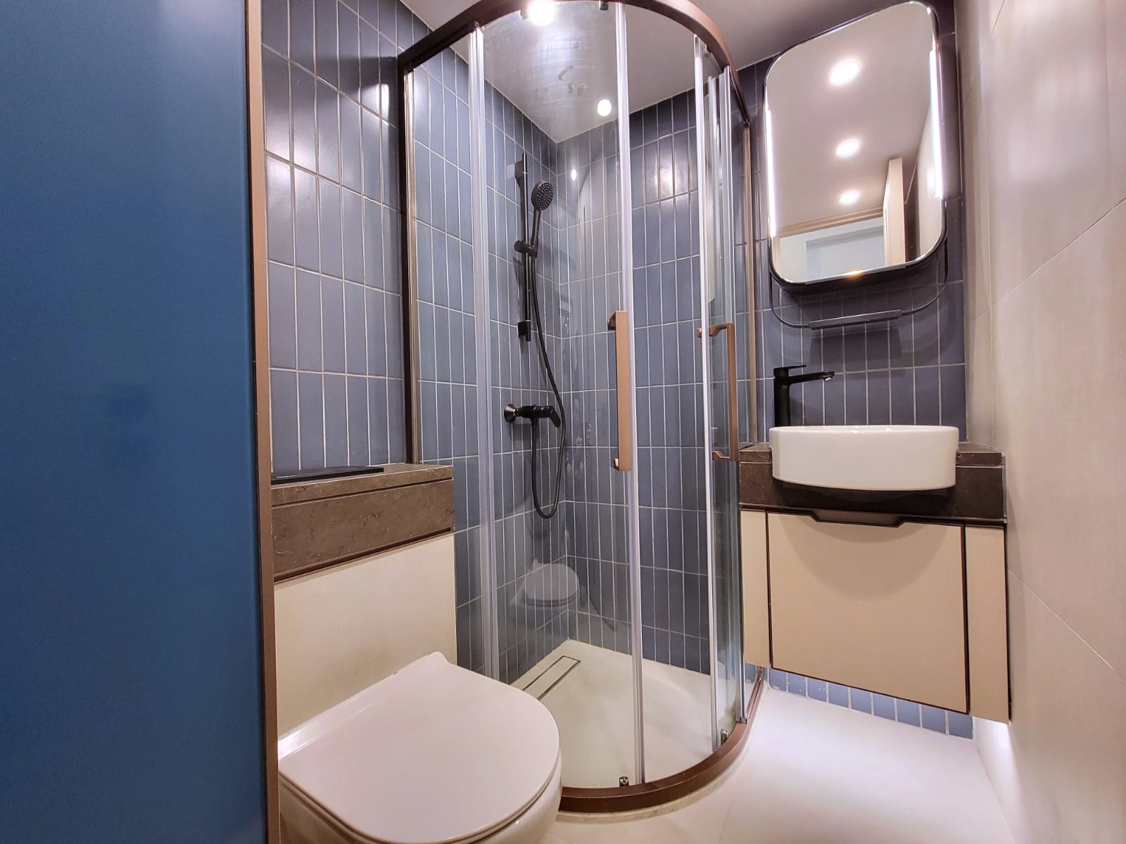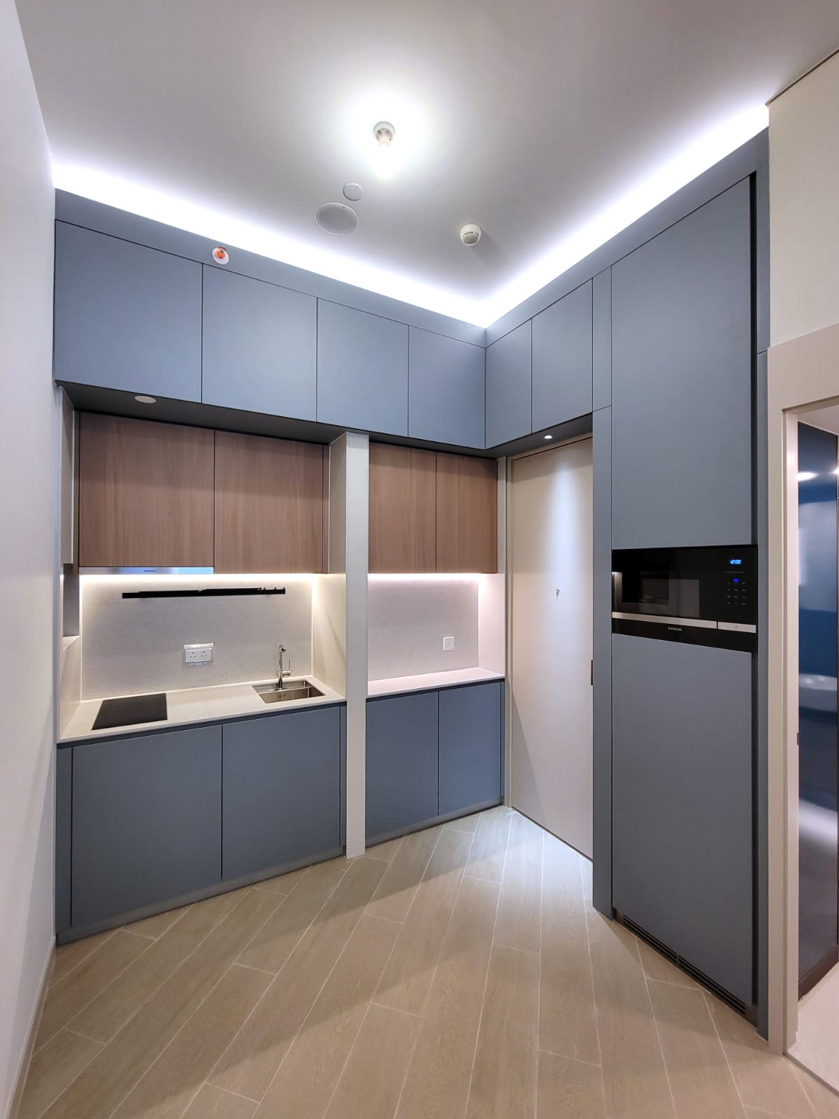 無改動示範單位的浴室牆身以溫柔米色搭配時尚藍色瓷磚打造,並配備一系列國際品牌浴室設備。此外,開放式廚房設備一應俱全,配置一系列德國品牌 Siemens電器,包括電磁爐、抽油煙機、洗衣乾衣機、嵌入式微波焗爐及雪櫃。