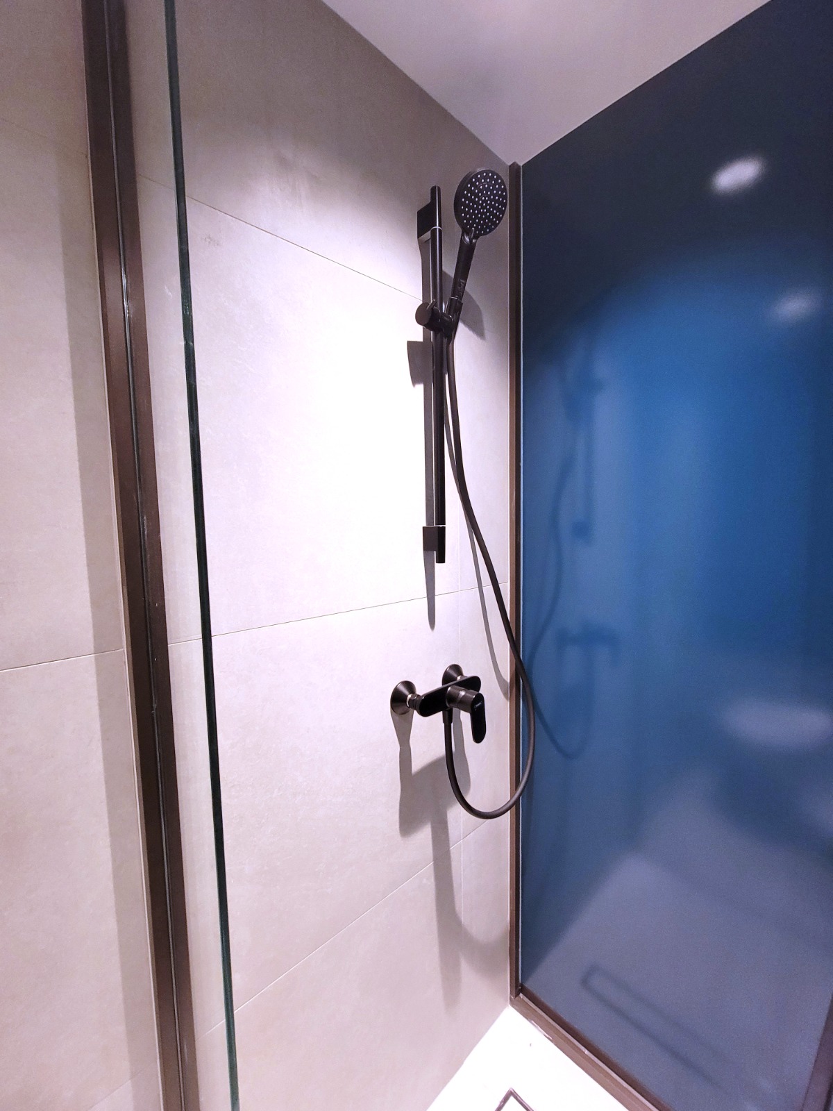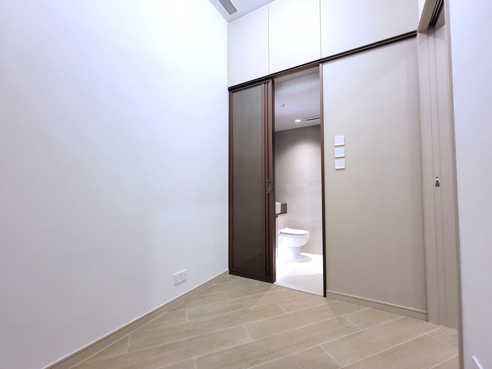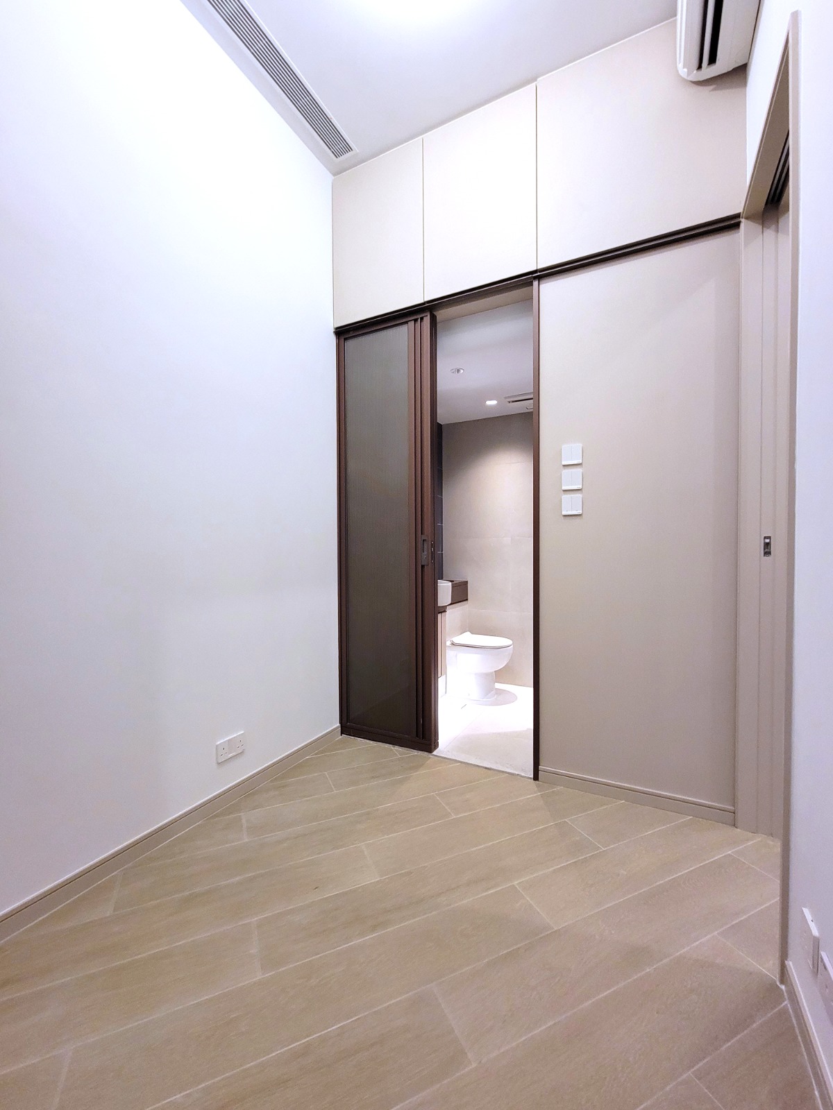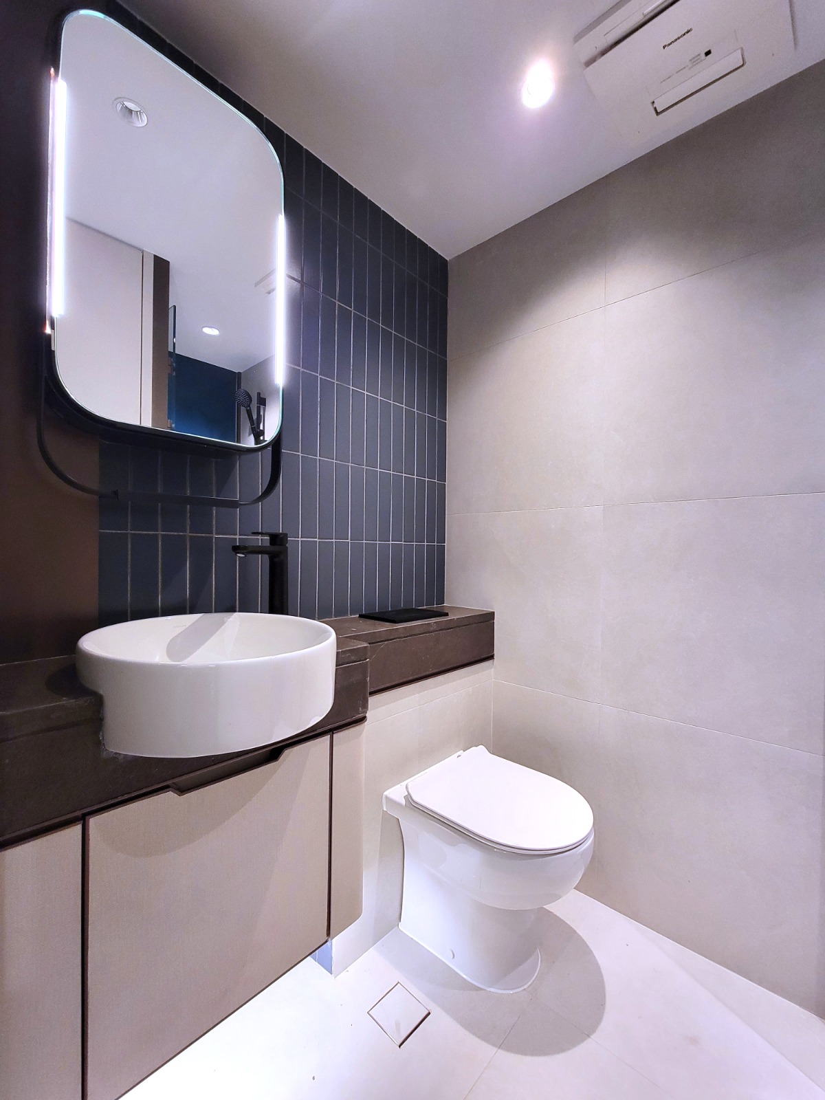 無改動示範單位的浴室牆身以溫柔米色搭配時尚藍色瓷磚打造,並配備一系列國際品牌浴室設備,其中包括日本Panasonic換氣暖風機。開放式廚房設備一應俱全,配置一系列德國品牌Siemens電器,包括嵌入式微波焗爐、嵌入式雪櫃、嵌入式電磁爐、抽油煙機及洗衣乾衣機。