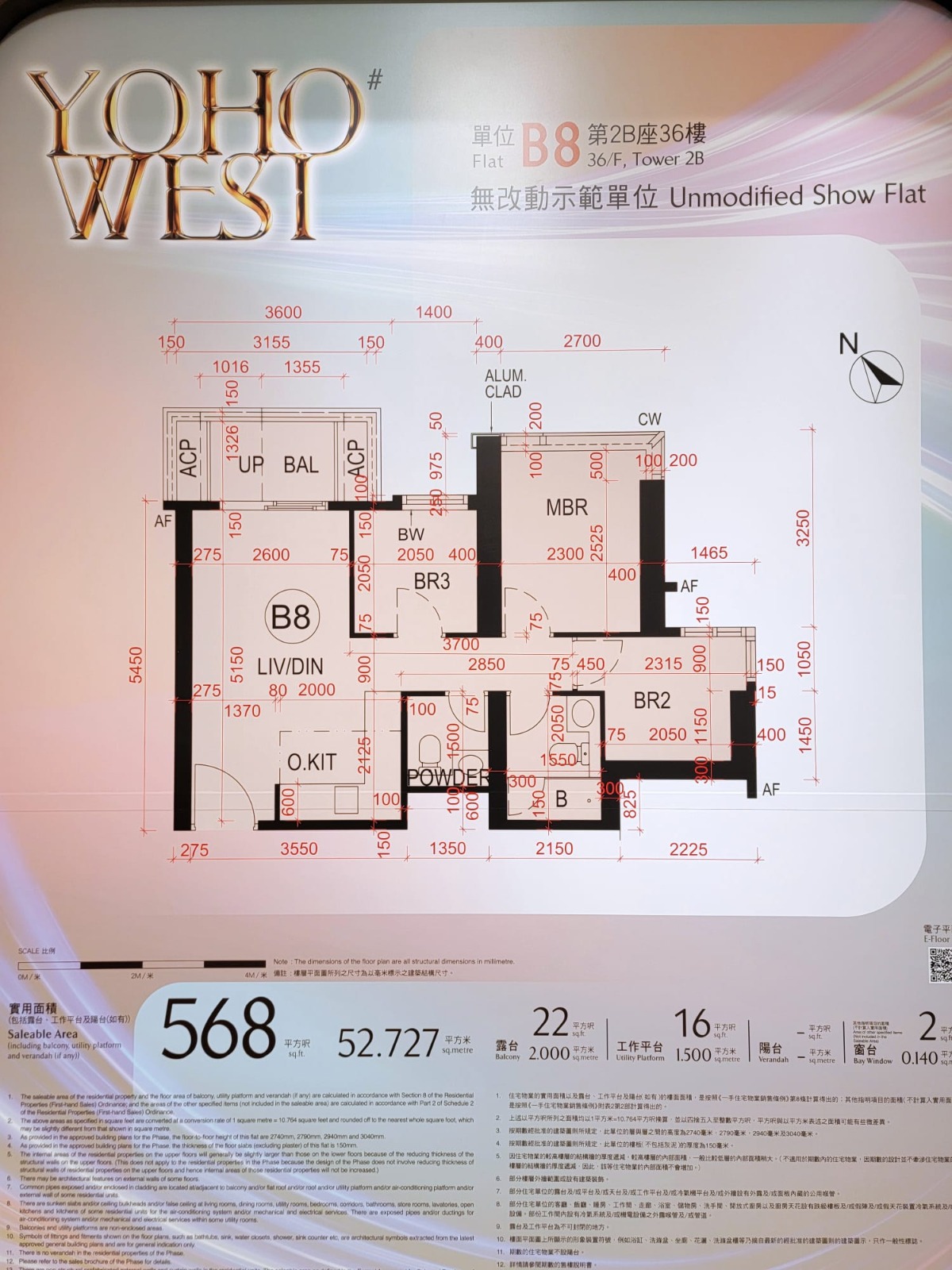以第2B座36樓B8室為藍本搭建的三房無改動示範單位,實用面積568方呎。開放式廚房設於大門右邊,單位客飯廳連接面積合共38方呎的「三合一」露台。長走廊通往寢區,三間睡房與客飯廳享同一坐向景觀,睡房2設L型窗,單位設有兩個洗手間,其中一個設有淋浴間。