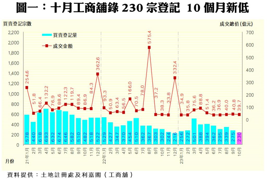 利嘉閣(工商舖)地產董事黃應年表示,工商舖買賣次季走高後,自年中起輾轉回落,惟冀盼十月份可成功築底,並隨《施政報告》振興經濟措施而漸轉佳境。根據利嘉閣(工商舖)地產資料所得,2023年十月全港共錄230宗工商舖物業買賣登記﹙數字主要反映2至4星期前市場實際狀況﹚,較九月減少16%,連跌兩個月兼創近10個月新低;至於月內買賣合約總值錄39.70億元,按月微跌3%,跌幅明顯少於登記量,主因月內有一項合計逾15億元的大額工廈登記撐起。