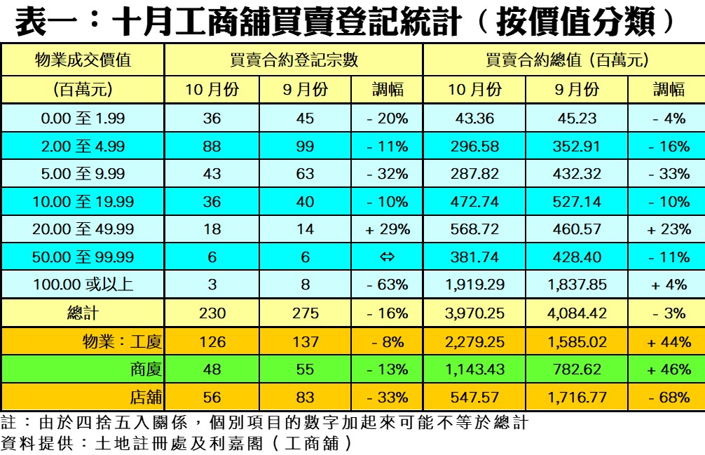 按工商舖三個物業類別劃分,工廈十月登記量下跌8%,為跌幅最少的物業類別,表現優於大市,按宗數計則仍是登記最多的類別,佔整體比例達54.8%,按月增加5個百分點。十月全月工廈共錄得126宗買賣,按月少8%;而月內涉及買賣登記金額則背馳大升44%,錄得22.79億元,主要受惠10宗涉及觀塘業發工業大廈合共近15.17億元的大手登記。