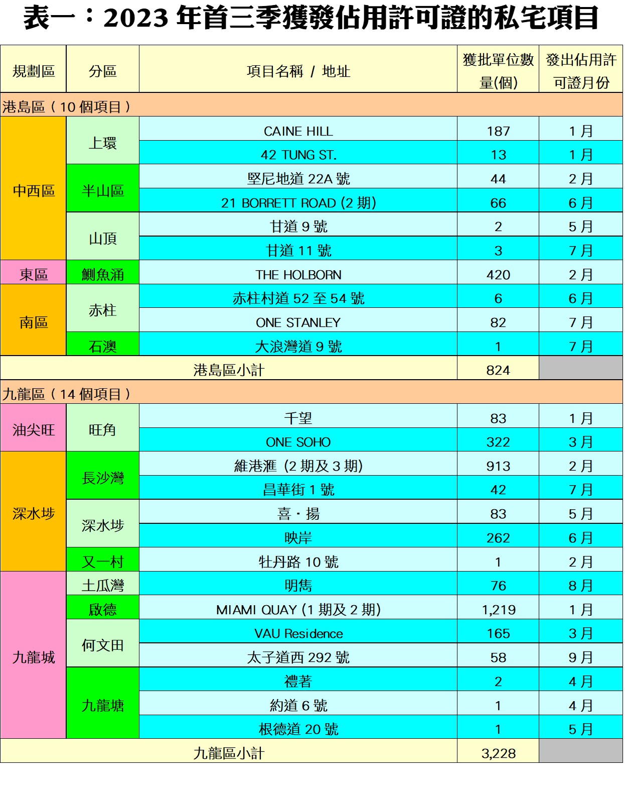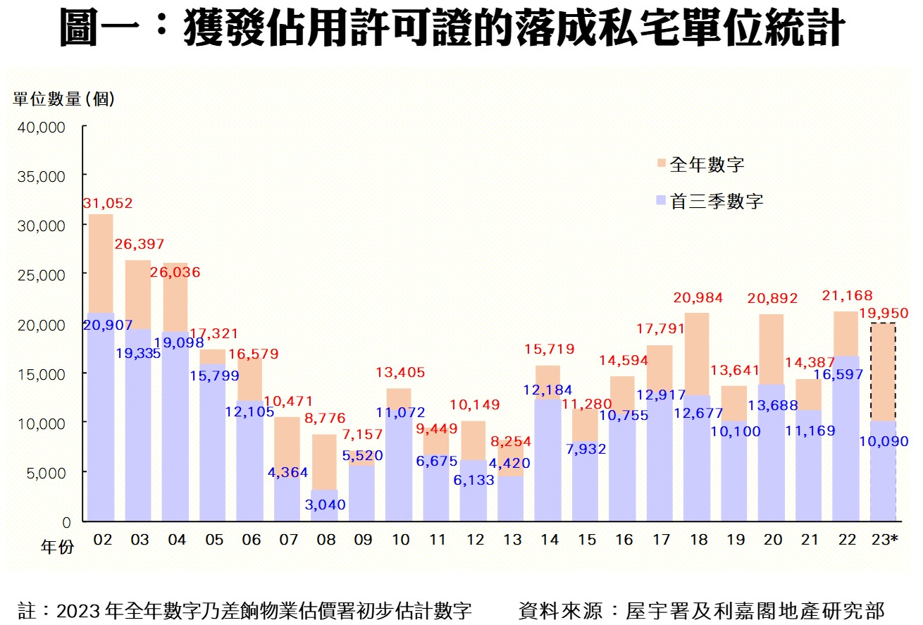 此外,私人住宅落成量方面,根據屋宇署今日最新發表的資料月報顯示,2023年九月份全港共有6個項目,合共2,309個私人住宅單位落成(以屋宇署發出佔用許可證的樓宇數量為準),較八月份的97伙急增22.8倍,創七個月新高;今年第三季合共2,534伙私宅落成,按季增加逾2.3倍。至於,今年首三季共有33個項目、涉及10,090伙私宅落成,佔差估署全年預測量約51%,較去年同期的16,597伙減少約39.2%,創八年同期最少。