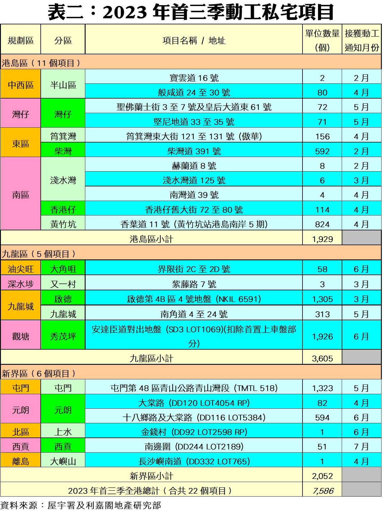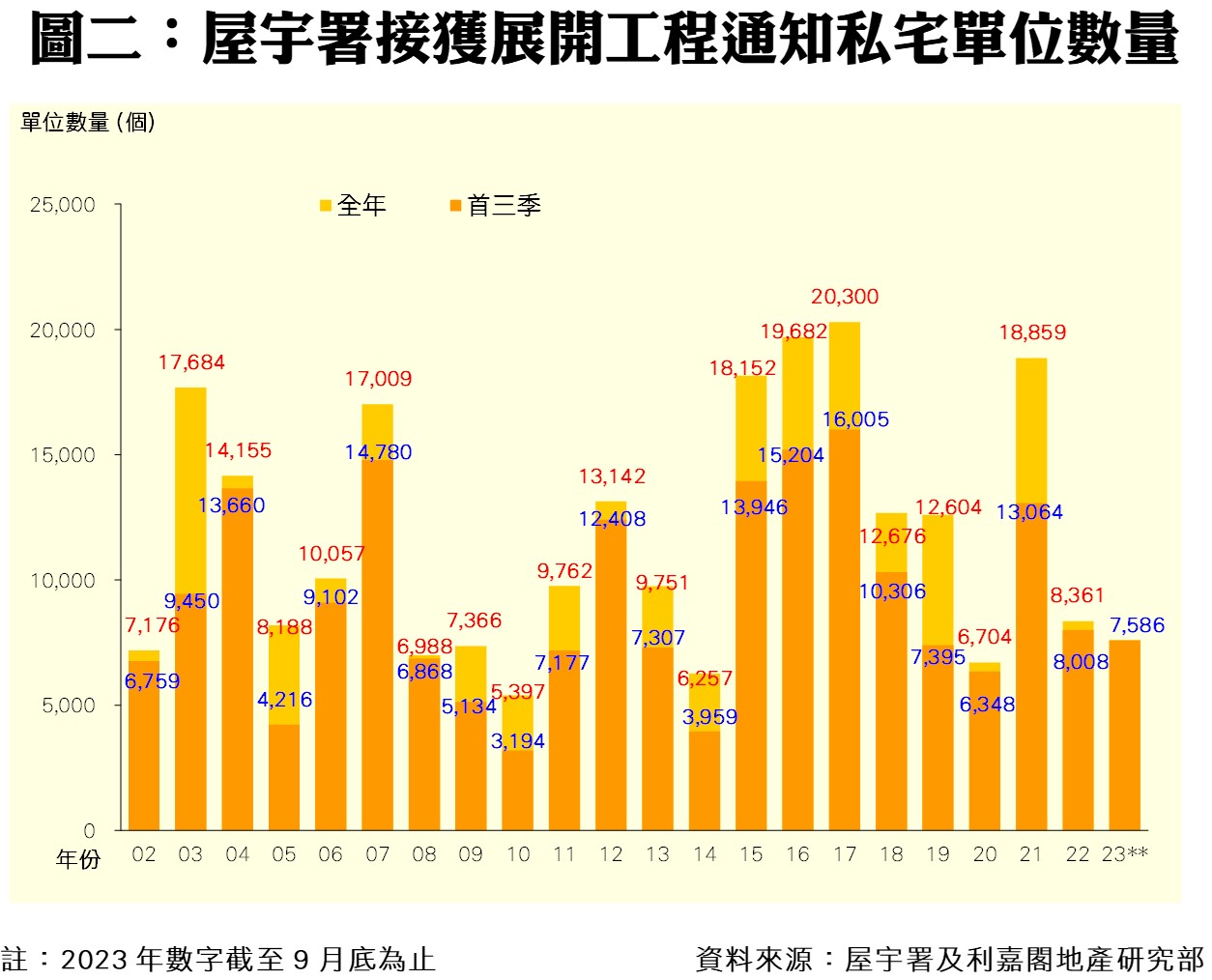 利嘉閣地產研究部主管陳海潮表示,私宅連續兩個月「零動工」,根據屋宇署今日發表最新數據,2023年九月份全港未有任何私宅項目動工(按屋宇署接獲上蓋建築工程動工通知為準),亦是有紀錄以來第十次「零動工」的月份。至於,今年首三季累積動工量僅7,586伙,較去年同期的8,008伙減5.3%,創三年同期最少;單一季度計算,今年第三季私宅動工量僅51伙,按季大減99%,創下有紀錄以來的季度新低。