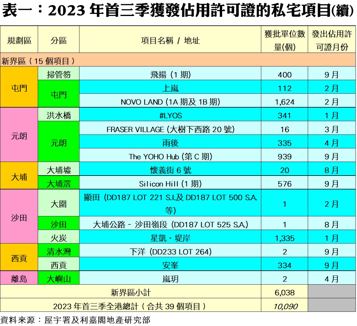 按地區劃分,今年首三季新界區共有15個項目、合共6,038個單位落成,佔整體比例約59.8%;九龍區共有14個項目落成,涉及單位總數3,228伙,佔同期整體私宅落成量約32.0%;港島區則有10個項目落成,涉及單位總數824伙,佔整體私宅落成量約8.2%。