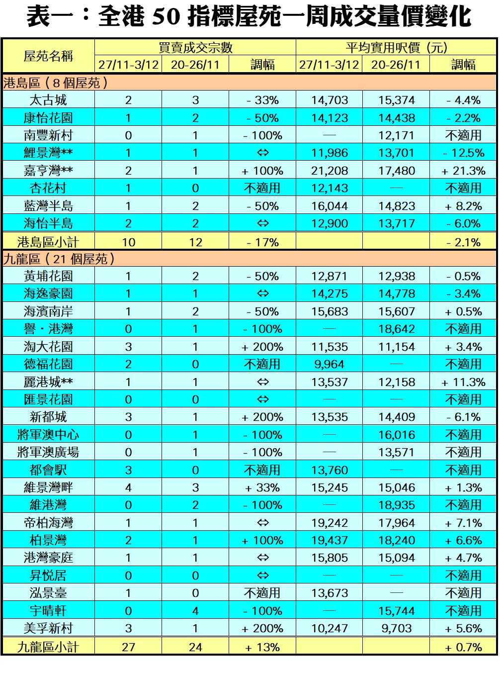 至於,港島區8個指標屋苑上周僅錄10宗成交,較前周的12宗減少17%,險守雙位數防線,其中南豐新村交投再現沉寂,於上周未聞成交;康怡花園及藍灣半島各錄1宗買賣,成交量按周砍半;太古城於期內錄2宗成交,較前周減少33%。此外,在全港50個指標屋苑當中,上周共有14個屋苑錄得「零成交」,與前周數量一致,當中九龍區及新界區分別佔7個及6個屋苑,港島區則佔1個(詳見表一)。