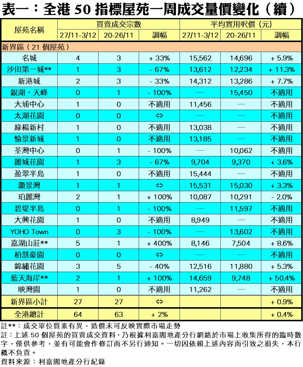 利嘉閣地產研究部主管陳海潮表示,減辣效應對市場的刺激作用雖然不太明顯,但亦有一定支持作用,二手市場交投縱然隨一手推盤而有起伏,但較減辣前的超低迷狀況已見改善。綜合利嘉閣地產分行數據所得,全港50個指標屋苑於上周(27/11—3/12)共錄64宗買賣個案,較前周(20/11—26/11)的63宗增加2%,連續兩周於60餘宗水平爭持。