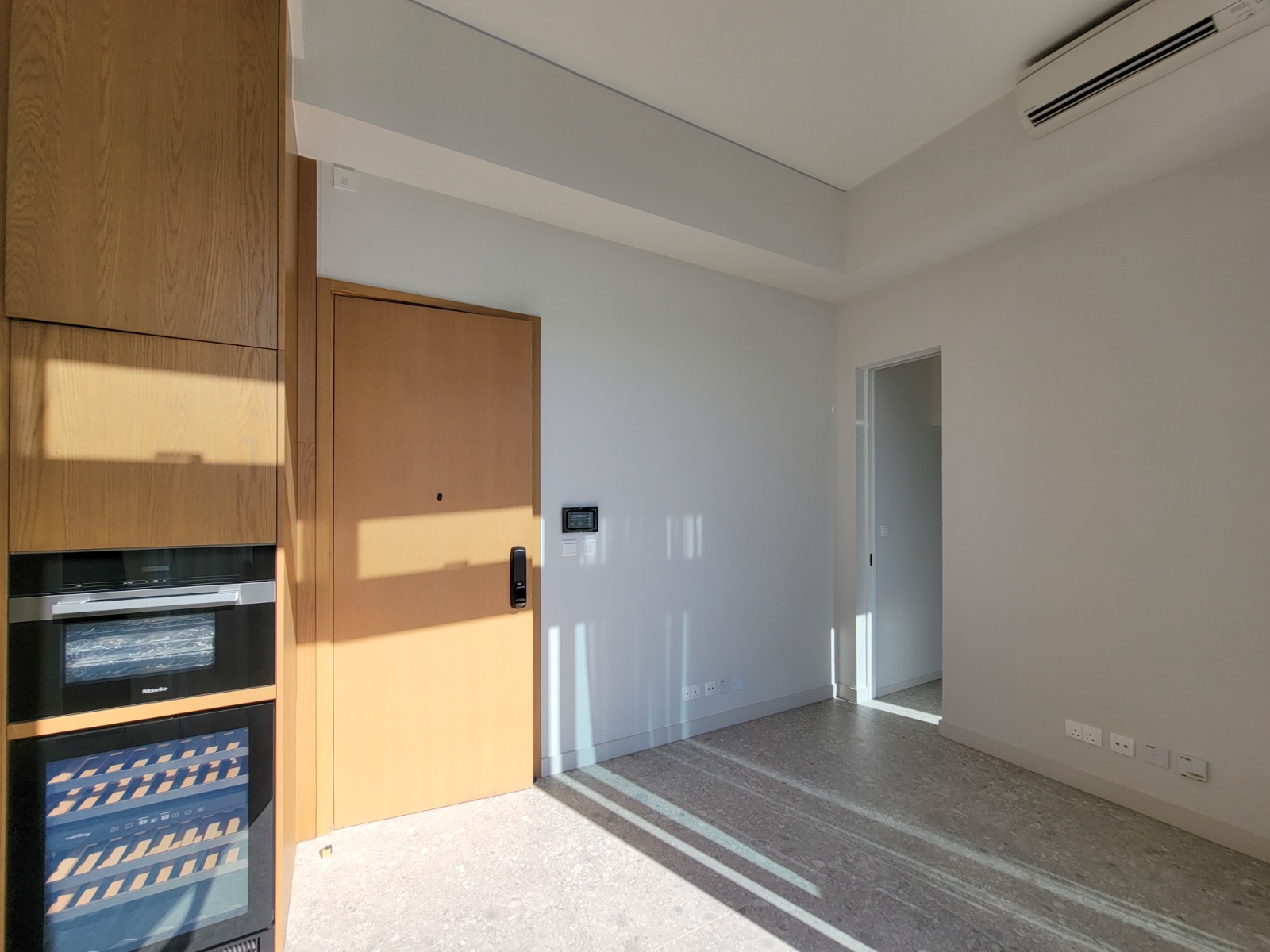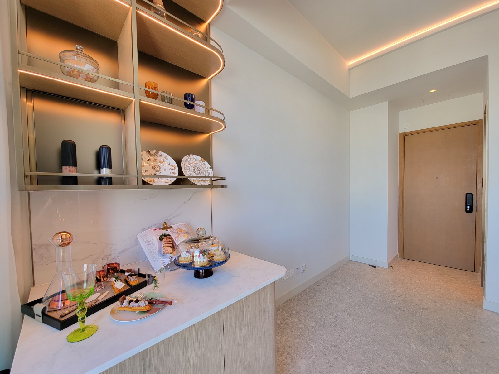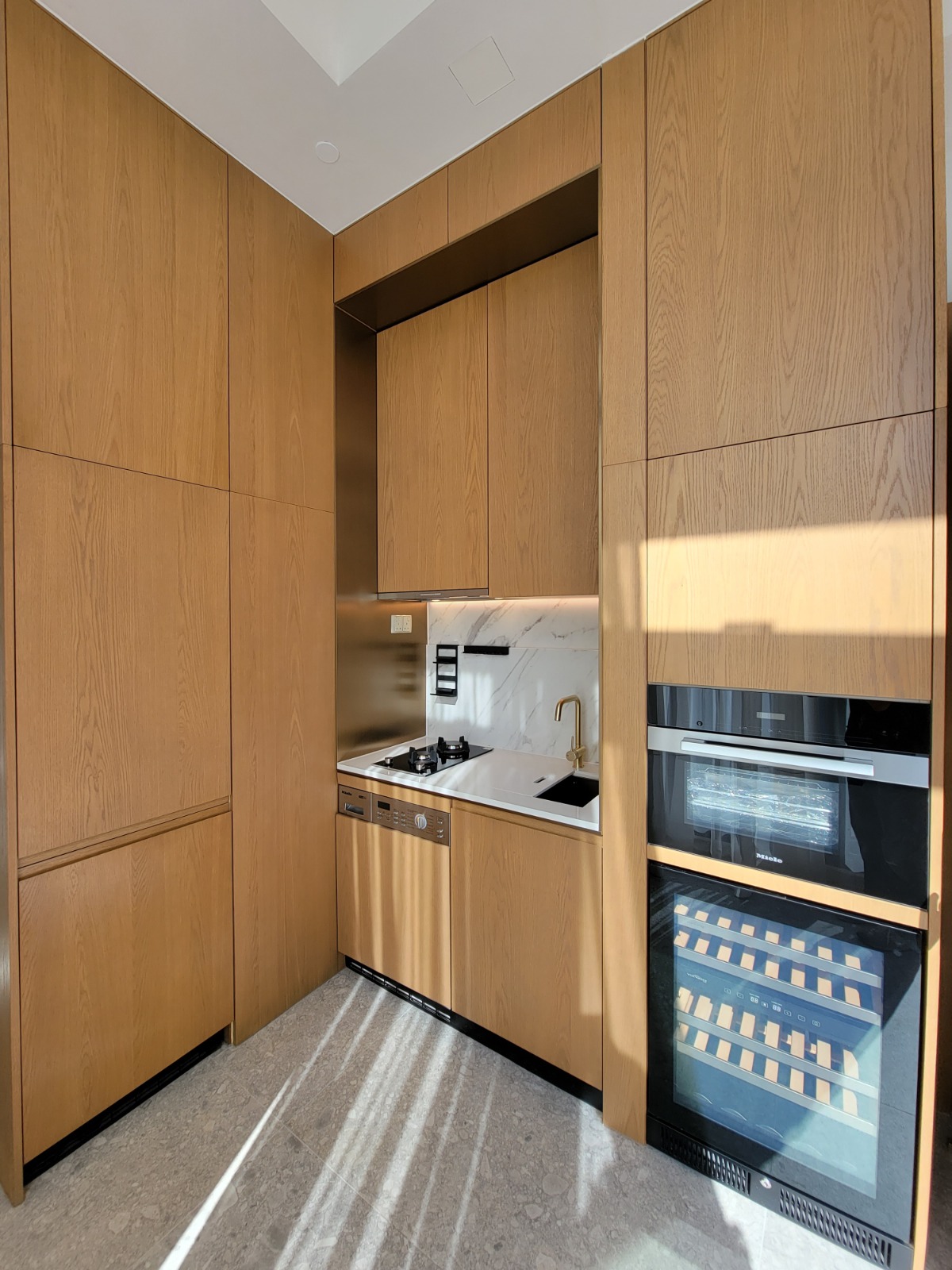 主人浴室設德國Kaldewei獨立浴缸,更精選意大利獲奬品牌,GESSI及the.artceram的衛浴設施及配件,同時裝設PANASONIC浴室寶及伸縮晾衣架,空間時刻乾爽,輕鬆晾乾衣物。鏡櫃設計簡約,更備有USB插槽。廚房採用開放式設計。單位配備德國高級電器品牌Miele的雪櫃、洗衣乾衣機、蒸爐及抽油煙機,意大利品牌Mia Cucina嵌入式煤氣煮食爐,亦配有法國Vinvautz酒櫃,時尚實用。
