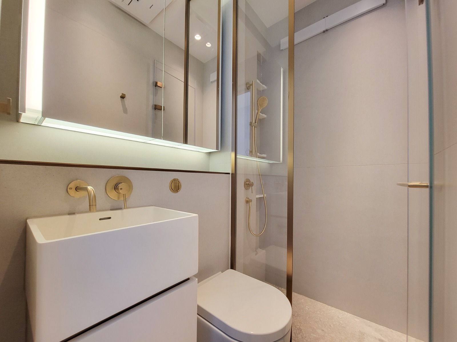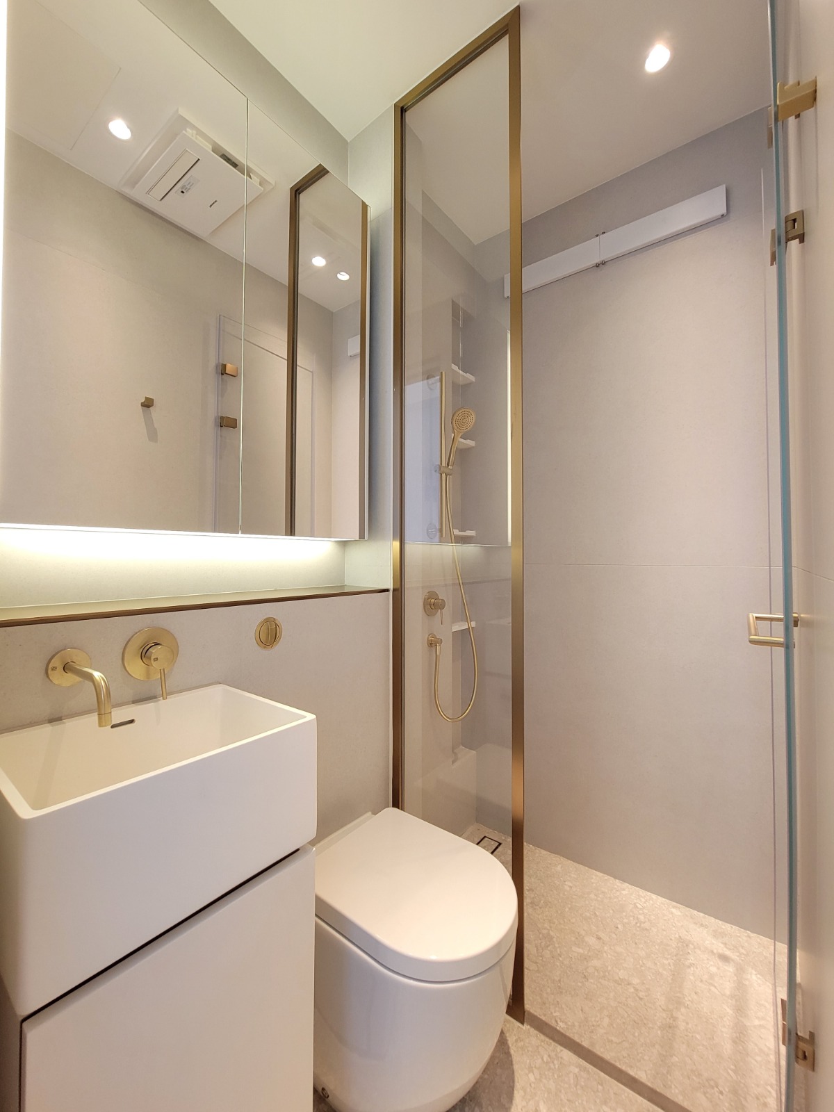 浴室精選意大利獲奬品牌GESSI及the.artceram的衛浴設施及配件,同時裝設PANASONIC浴室寶及伸縮晾衣架,空間時刻乾爽,輕鬆晾乾衣物。鏡櫃設計簡約,更備有USB插槽。