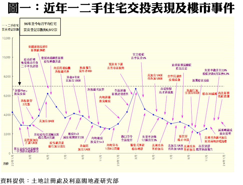 一手私宅市場方面,踏入2023年之初,受惠新冠疫情轉緩,通關可期下,一手市場逐漸轉趨活躍,發展商積極推盤,首季的3個月均在低基數下實現連番倍數式上升。不過通關後,市道復甦步伐不如預期,加上美國自2月起連番加息,拖累次季一手買賣逐漸萎縮,時至第三季按月均維持在少於一千宗的相對低水平窄幅徘徊。至於第四季在息口高企及經濟股市表現同告失色下,新盤銷情亦進一步受壓,一度墮回年初低3位數水平。