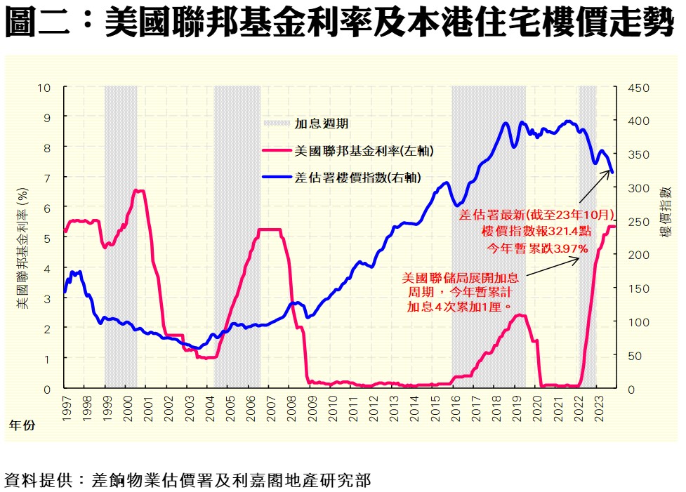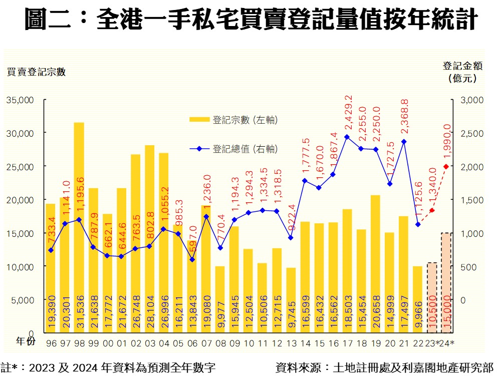利嘉閣地產總裁廖偉強指出,2022年樓價全年下挫15%,為自1998年急挫32.5%後,25年以來最大的按年跌幅,而2023年樓價料跌7%,亦是過去15年來的次大跌幅,並且是繼2003年沙士後,21年來首度再現連續2年下跌的淡況。導致樓價罕有地連跌兩年的元凶是繼2008年之後,16年來從未見過的高息環境,令計劃入市者不知所措,窒礙交投進度。不過,市場也得逐漸習慣及適應沒有永遠接近「零息」的現實,加上息口正趨向見頂,而樓市需求將隨專才到位而大增,2024年樓市於年初觸底後,有望拗腰回升,實現量價齊彈,明年樓市將是不一樣的一年。