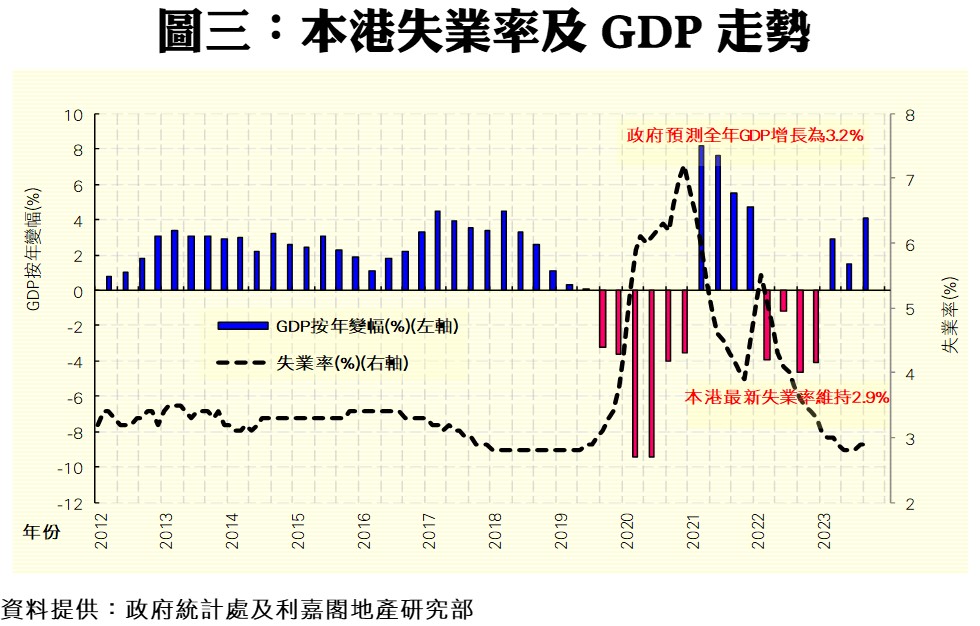 2023年樓市先高後低,年初受通關刺激,一度衝高,量價齊升,惟受持續加息影響,而且經濟復甦較預期慢,股市亦屢創低位,入市動力無以為繼,結果次季開始即踏上量價齊挫之途,全年私宅買賣登記繼去年後再度寫下歷史新低。然而,10月下旬實施13年的樓市三大辣稅終獲放寬,當局亦銳意引入大量專才,為樓市帶來新動力,市況開始乍現曙光;預期2024年本港樓市將會不一樣,整體住宅交投有望谷底回升,量價料在低基數下錄得可觀升幅,當中一手交投料重登1.5萬宗;而二手劍指4萬宗;至於租金及樓價料將雙翼齊飛,前者看升6%,後者冀漲8%。