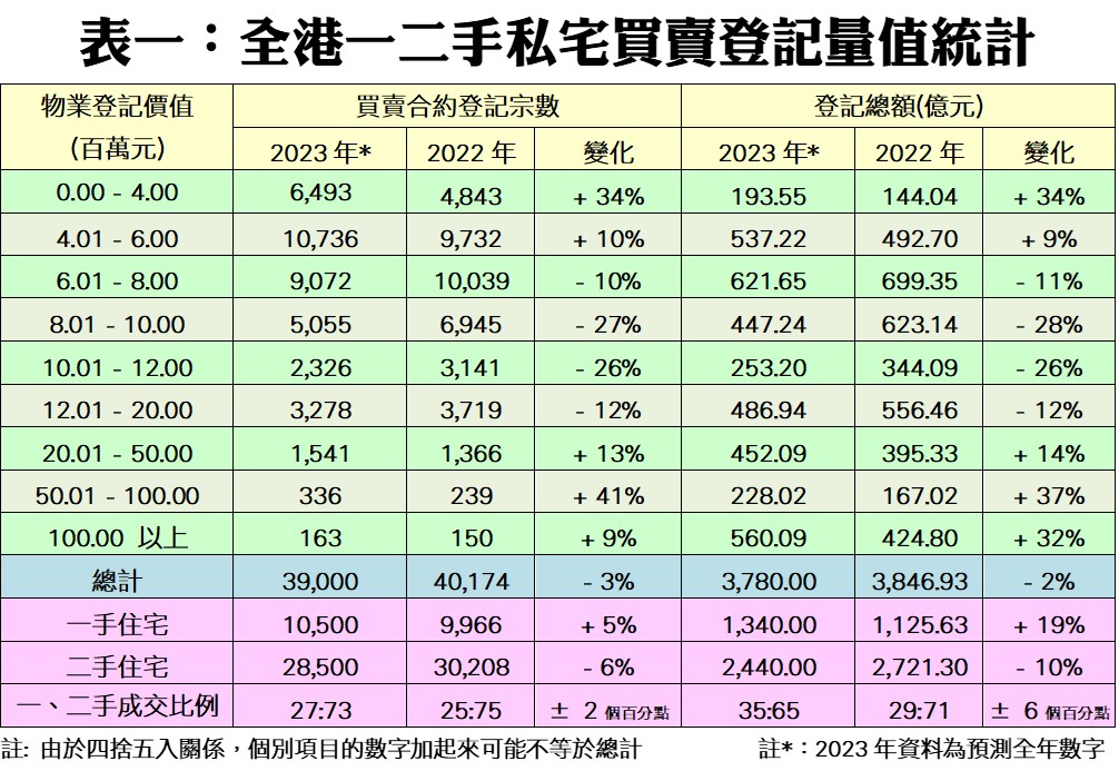 總結整體私宅表現,根據土地註冊處資料,截至今年12月11日為止,2023年整體私人住宅累錄36,727宗買賣登記,涉及金額約為3,585.47億元。按走勢推算,預計今年全年登記量最終只能錄得約3.90萬宗的破新低水平,較2022年再跌3%,勢連續兩年迭創1996年有紀錄以來的史上新低;物業成交總值方面,預測全年將減少2%,至約3,780億元,連跌兩年,創下近10年來的低位(見附錄圖一及附錄表一)。