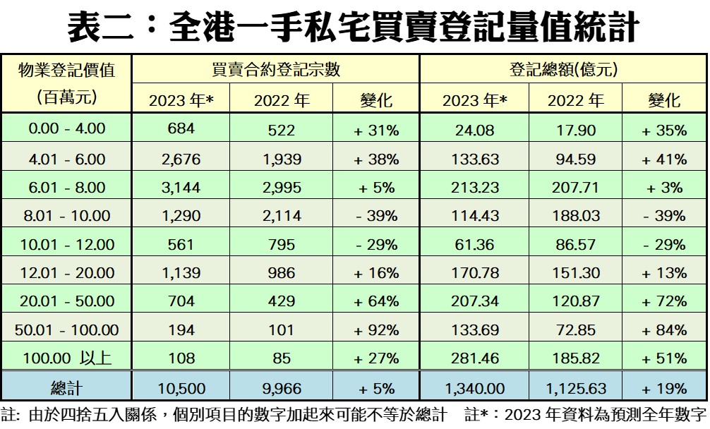 總結2023年一手私宅市場,截至12月11日為止,買賣登記量值分別錄得9,516宗及1,227.26億元,料全年相關量值最終可達約10,500宗及約1,340億元,將較去年分別微升5%及大增19%(見附錄圖二及附錄表二)。雖然全年登記量重登萬宗之上,惟實際升幅輕微,是繼2013年一手新例歷史新低、2022年疫情及2008年金融海嘯後的史上第四低年度。至於2023年每宗一手私宅平均成交價料為1,276萬元,按年將升13%。