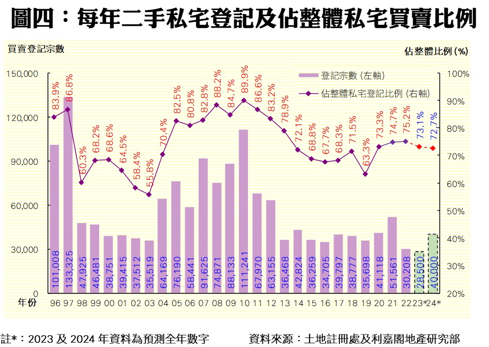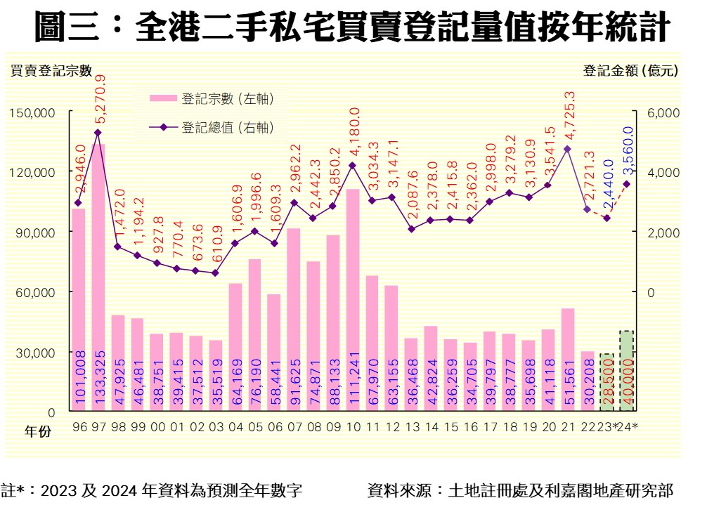 在整體私宅成交金額方面,受惠交投拗腰回升刺激,2024年一二手私宅合共成交總值料可按比例大增47%,挑戰5,550億元水平,除創3年新高外,也有機會成為繼2021年及1997年後的史上第三高水平 (見表一及附錄圖一)。