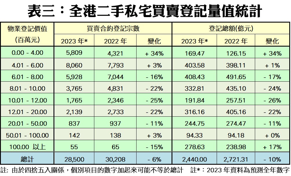 截至今年12月11日為止,二手私宅買賣登記量值分別錄27,211宗及2,358.21億元,預期全年登記量最終錄約2.85萬宗,較2022年的3.02萬宗再跌約6%,除連續兩年迭創歷史新低外,更為史上首度失守3萬宗大關,可見二手步入冰河時期。至於全年成交總值料達2,440億元,將按年挫約10%,也連跌兩年,料創近7年以來新低(見附錄圖三及附錄表三)。按每宗二手私宅平均成交價計算,2023年料為856萬元,將按年跌約5%。