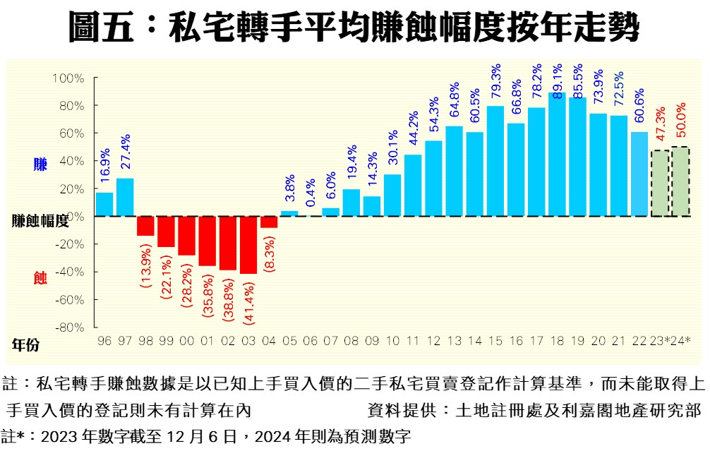 過去5年以來,自2018年中美貿易戰及之後的社會運動、疫情及加息多項不利因素接連衝擊下,樓價表現反覆偏軟,其後更跌勢加劇,數年期間,除有移民盤急售外,也有投資者沽貨套現,因而導致由2019年起,二手私宅轉手每宗平均賺幅連年下跌,由2018年的高位89.1%,一直回落至今年度的47.3%(期間合共累跌了41.8個百分點),創下12個年度以來的新低(見附錄圖五)。