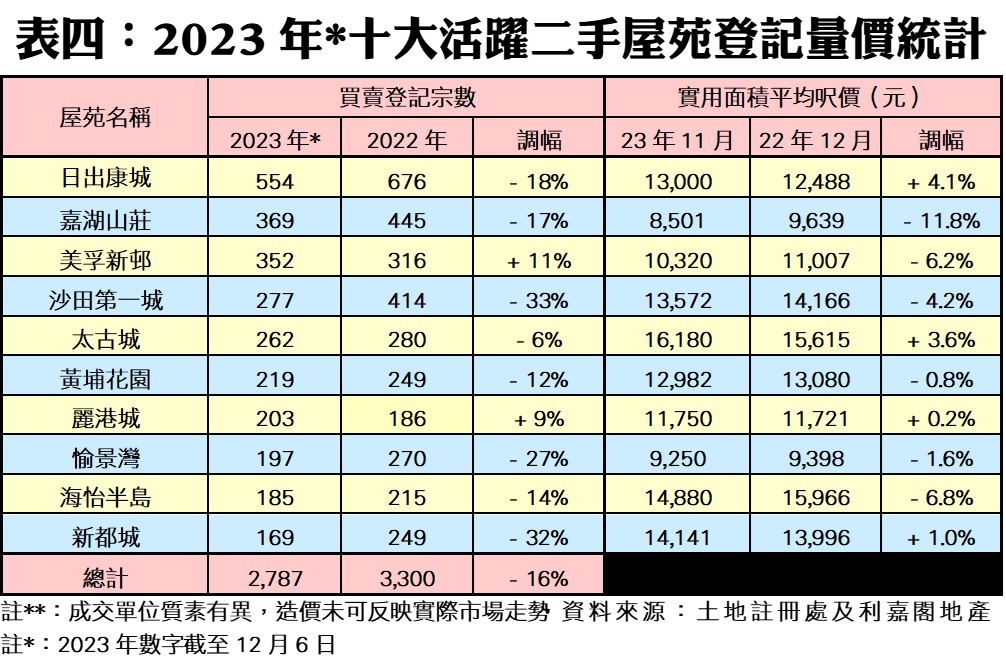 另外,按十大活躍二手屋苑表現分析,截至2023年12月6日為止,日出康城蟬聯為今年買賣登記量最活躍的屋苑,暫時累錄554宗登記,惟較去年全年所錄得的676宗少18%;其次為嘉湖山莊的369宗及美孚新村的352宗,兩者分別暫較去年全年少17%及多11%。至於另一熱門老牌屋苑─黃埔花園今年暫時守在第六位,錄219宗登記,按年暫時少約12%。此外,十大活躍屋苑合計暫共錄得2,787宗登記,較2022年全年的3,300宗少16%(見附錄表四)。