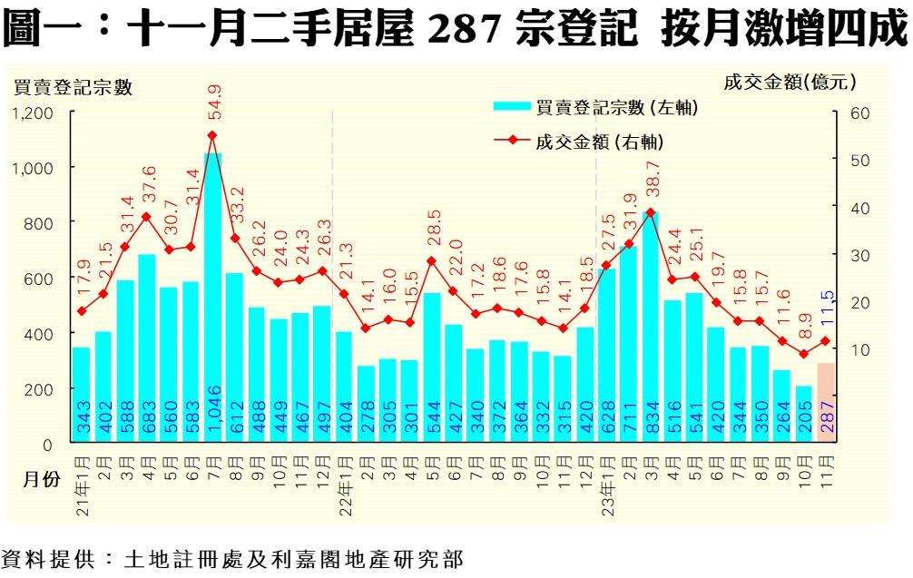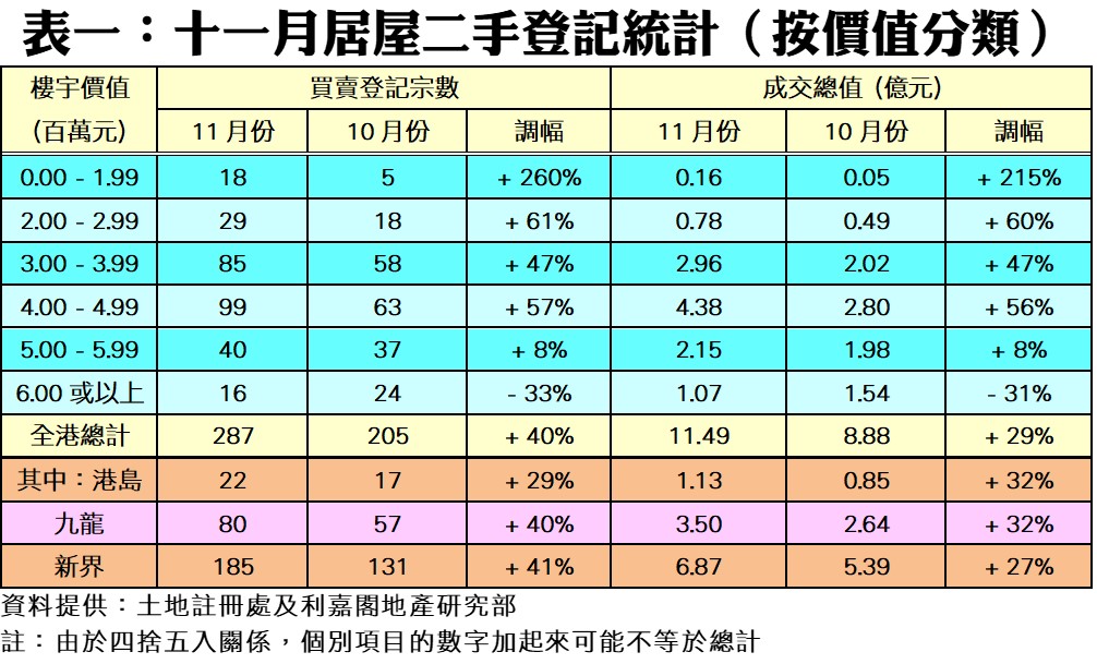利嘉閣地產研究部主管陳海潮表示,《施政報告》釋出多項樓市減辣措施,當中包括延長居屋擔保期及承造按揭年期,有助加快居屋於二手市場中流轉,協助上車客圓置業夢。然而,部分居屋客仔細解讀相關政策後,認為兩項措施均會構成業主提價的誘因,當機立斷選擇入市,令二手居屋登記量止跌回升。根據土地註冊處最新數據顯示,十一月份全港錄得287宗居屋二手買賣登記(包括第二市場及自由市場),較十月份的205宗按月急升40%,終止兩連跌;至於期內成交總值錄約11.49億元,較前月的8.88億元,按月同步增加約29%,重返10億元之上水平。