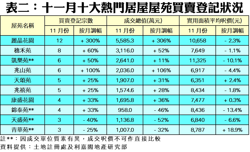 如按屋苑細分(見表二),十一月九龍灣麗晶花園錄12宗買賣,按月增加3倍;而該屋苑成交總值亦同步增加約3.06倍至5,585.3萬元,登記量及總值均高踞十大熱門居屋榜榜首。至於屈居亞軍的沙田穗禾苑,上月亦錄8宗登記,涉資3,116萬元。