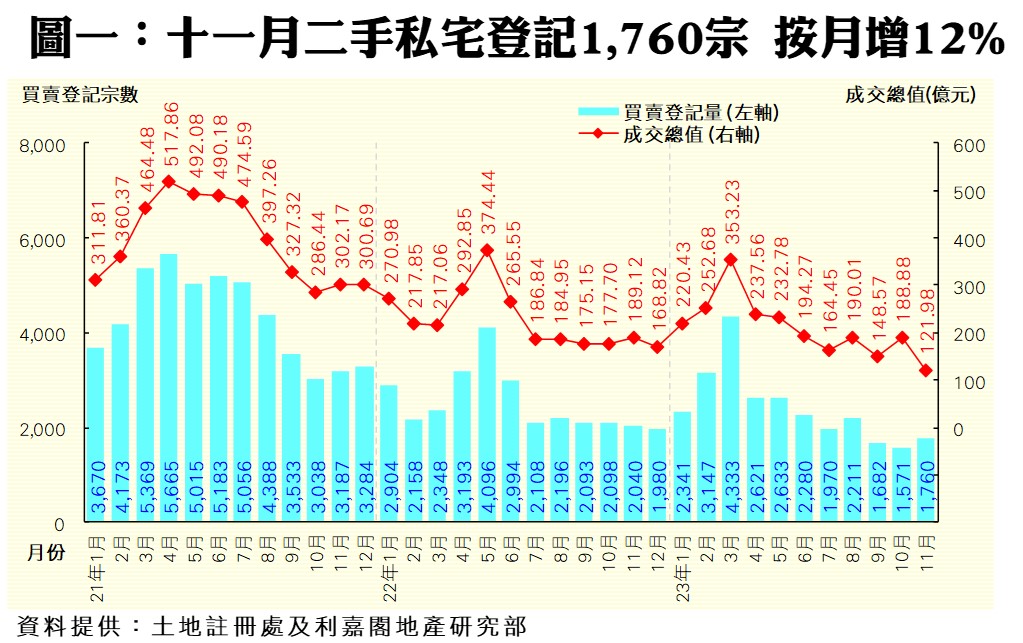 利嘉閣地產研究部主管陳海潮表示,樓市減辣及息口見頂未及力挽2023年二手市場頹勢,料全年二手私宅買賣登記連續第二年創歷史新低!根據土地註冊處數據所得,2023年十一月份全港共錄1,760宗二手私宅買賣登記(數字主要反映十月中旬至十一月上旬期間的市場實況),較十月份的1,571宗回升12%,為連跌兩月後反彈,創近3個月高位。至於,十一月份登記總值按月背馳大跌35%,錄得121.98億元,創自2016年四月以來的92個月(即逾7年半)新低,主因前月有1宗涉資63.1億元的巨額收購強拍個案抽高基數所致。
