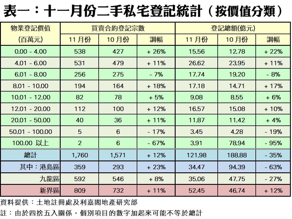 今年十一月份,按二手私宅價值分類,九個價格組別的買賣登記量錄得六升三跌,當中以樓價400萬元或以下組別的升幅最大,按月大升26%至538宗登記,並成為月內登記量最多的銀碼層;而801萬至1,000萬元及1,201萬至2,000萬元者亦分別增18%及12%,至194宗及112宗(見表一)。另外,登記量跌幅最急者為1億元以上的豪宅登記,按月挫67%,僅得2宗;此外5,001萬至1億元組別的登記量按月也跌17%至5宗。