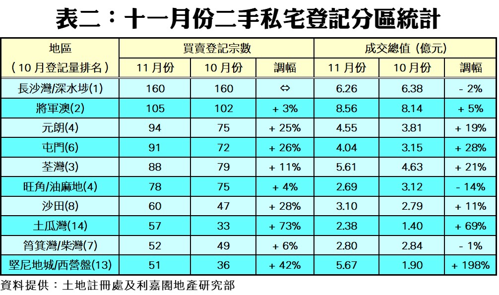 按全港三區作分析,十一月份港九新界三區登記量全線上升。當中,港島區登記量按月大漲23%,跑贏大市,月內錄得359宗登記;新界區按月也升11%,共錄809宗登記;至於九龍區微升8%,錄592宗。另外,十大最活躍成交分區的登記量亦大部分錄得升幅,當中以土瓜灣區的漲幅最勁,月內錄得57宗登記,按月大升73%。至於堅尼地城/西營盤區及沙田區亦分別錄得42%及28%的升幅,前者錄得51宗,後者則有60宗;長沙灣/深水埗區則蟬聯登記量最多的分區,按月持平在160宗。