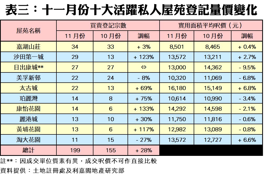 此外,上月十大活躍二手私人屋苑登記量中,錄得七升、兩跌及一持平,其中以康怡花園升幅最顯著,月內錄得14宗登記,按月激增1.33倍;其次的沙田第一城有29宗登記,按月亦大升1.23倍。此外,上月嘉湖山莊再下一城成為登記量最活躍的屋苑,共錄34宗,按月微升3%。次位的沙田第一城也以29宗壓過日出康城的27宗,分別排在第二及第三位,而排第四位的美孚新村則有22宗,按月逆市跌8%。此外,上月十大活躍屋苑總計登記量達199宗,較十月的155宗大升28%。