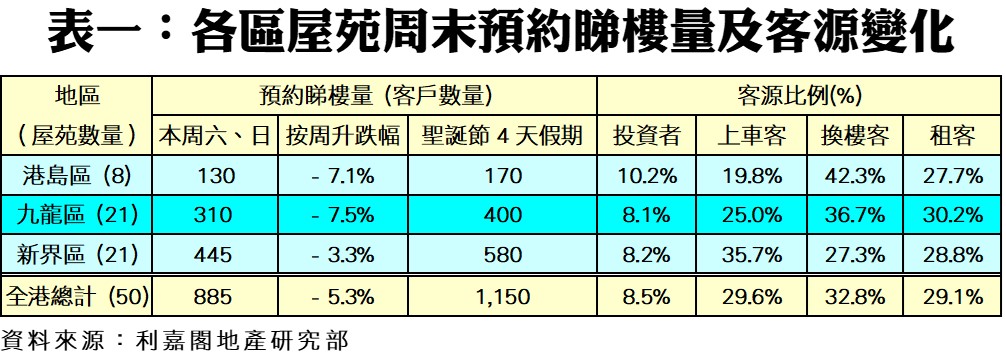 利嘉閣地產研究部主管陳海潮表示,適逢三年疫情後首個聖誕連假,港人外遊需求殷切,本地市面人流漸見疏落,準買家和業主亦紛紛擱置睇樓安排,本周末二手指標屋苑預約睇樓量轉勢回落。根據利嘉閣地產研究部數據估算,全港50個指標屋苑共錄885組客戶於周末預約睇樓,按周下跌5.3%,兩周升勢告終,而聖誕節4天假期則約有1,150組客戶。