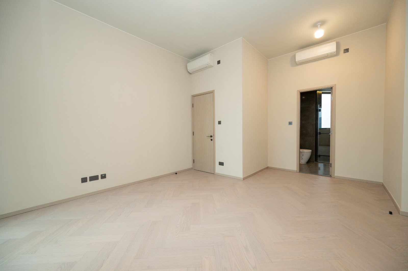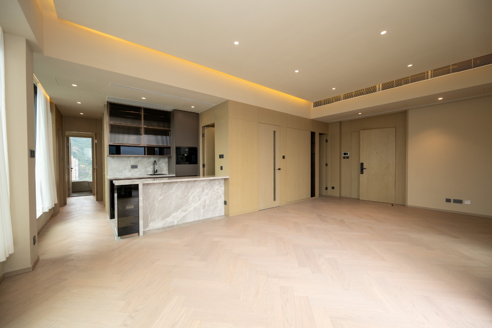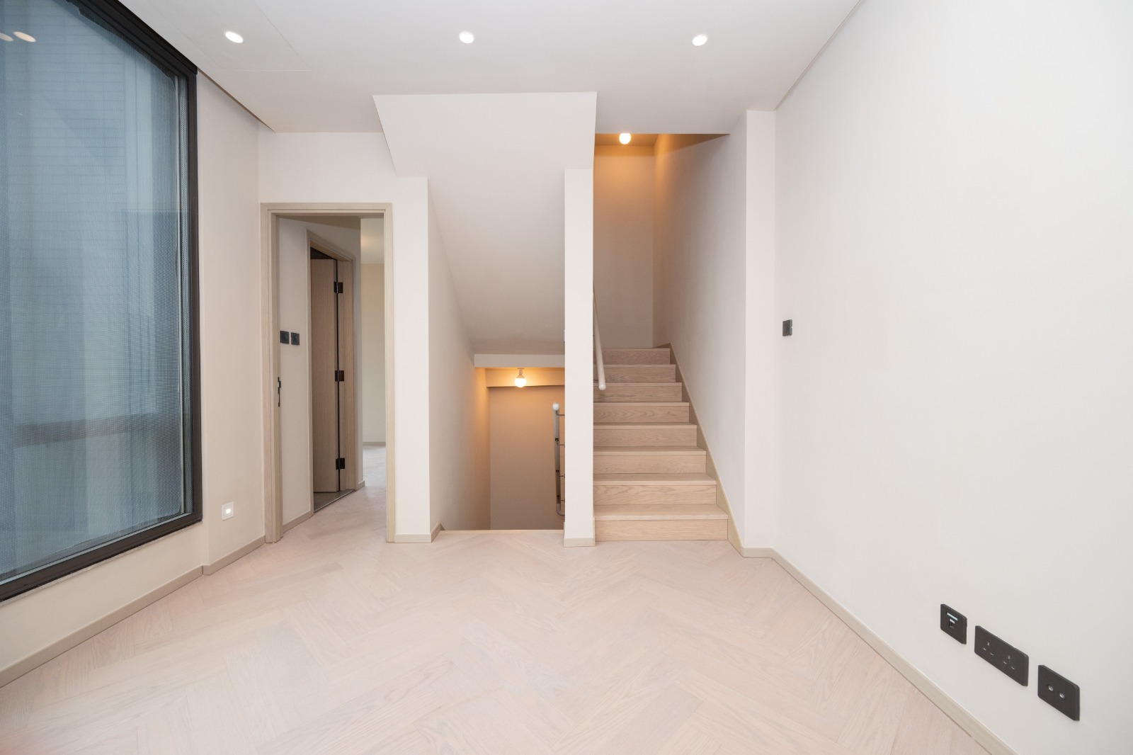 上層寢區則設有家庭廳及三個房間,當中主人套房空間寬敞,樓層高度3.5米,房間長約4.025米,闊約3.775米,實用面積約164方呎,擺放雙人床後,仍可三邊落床,外接露台,景觀開揚。