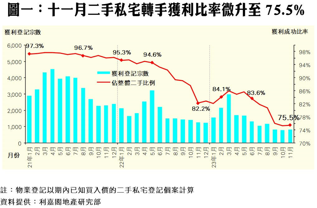 利嘉閣地產研究部主管陳海潮表示,二手私宅轉手獲利比率初見觸底反彈,冀隨著減辣效應及息口見頂,後市盼有進一步改善。綜合土地註冊處資料所得,2023年十一月份全港1,077宗已知上手購入價的二手私宅買賣登記中,帳面獲利個案共813宗,佔比75.5%,為連跌5個月後轉穩,較前月谷底的75.3%輕微反彈0.2個百分點,但仍屬14年半以來的次低水平。