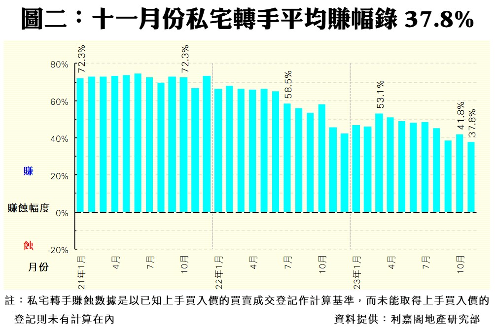 另外,數據顯示今年十一月份每宗私宅轉手個案平均賺幅為37.8%(見圖二),按月跌4個百分點,除連續7個月處於50%以下的低水平外,更創自2011年二月以來的154個月(即12.8年)新低,亦為期內第3度低於40%水平。十一月份,帳面獲利1倍或以上的轉手個案佔整體二手私宅買賣比例為34.4%,按月跌1.5個百分點,共錄371宗;至於帳面錄得虧損者達256宗,佔比按月持平在23.8%,維持在2009年六月以來的174個月(即14年半)按月高位;而平手的個案則有8宗,佔比微跌0.3個百分點至0.7%。