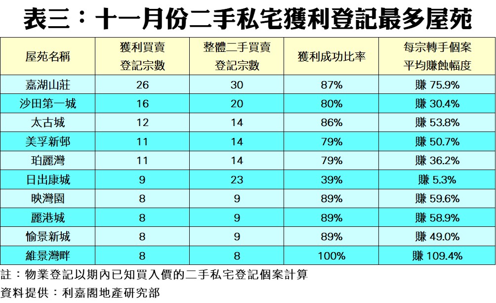 11月私宅轉手獲利率觸底回升至75.5% 平均每宗賺幅37.8% 近13年最少