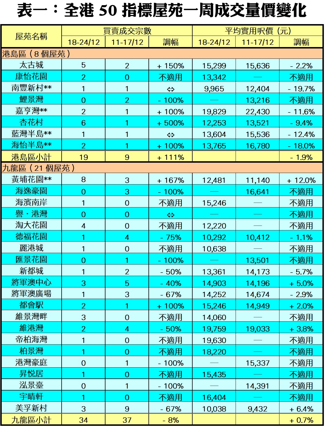 至於,九龍區21個指標屋苑上周共錄34宗交投,較前周的37宗減少8%,當中德福花園及將軍澳廣場上周各錄1宗買賣,按周分別減少75%及67%;美孚新村交投量由前周的9宗,減少67%至上周的3宗;新都城及維港灣各錄1宗及2宗成交,按周分別減少50%;將軍澳中心期內錄得3宗買賣,較前周的5宗減少40%。此外,在全港50個指標屋苑當中,上周共有17個屋苑錄得「零成交」,與前周的數量相同,當中九龍區及新界區分別佔5個及11個屋苑,港島區則佔1個(詳見表一)。