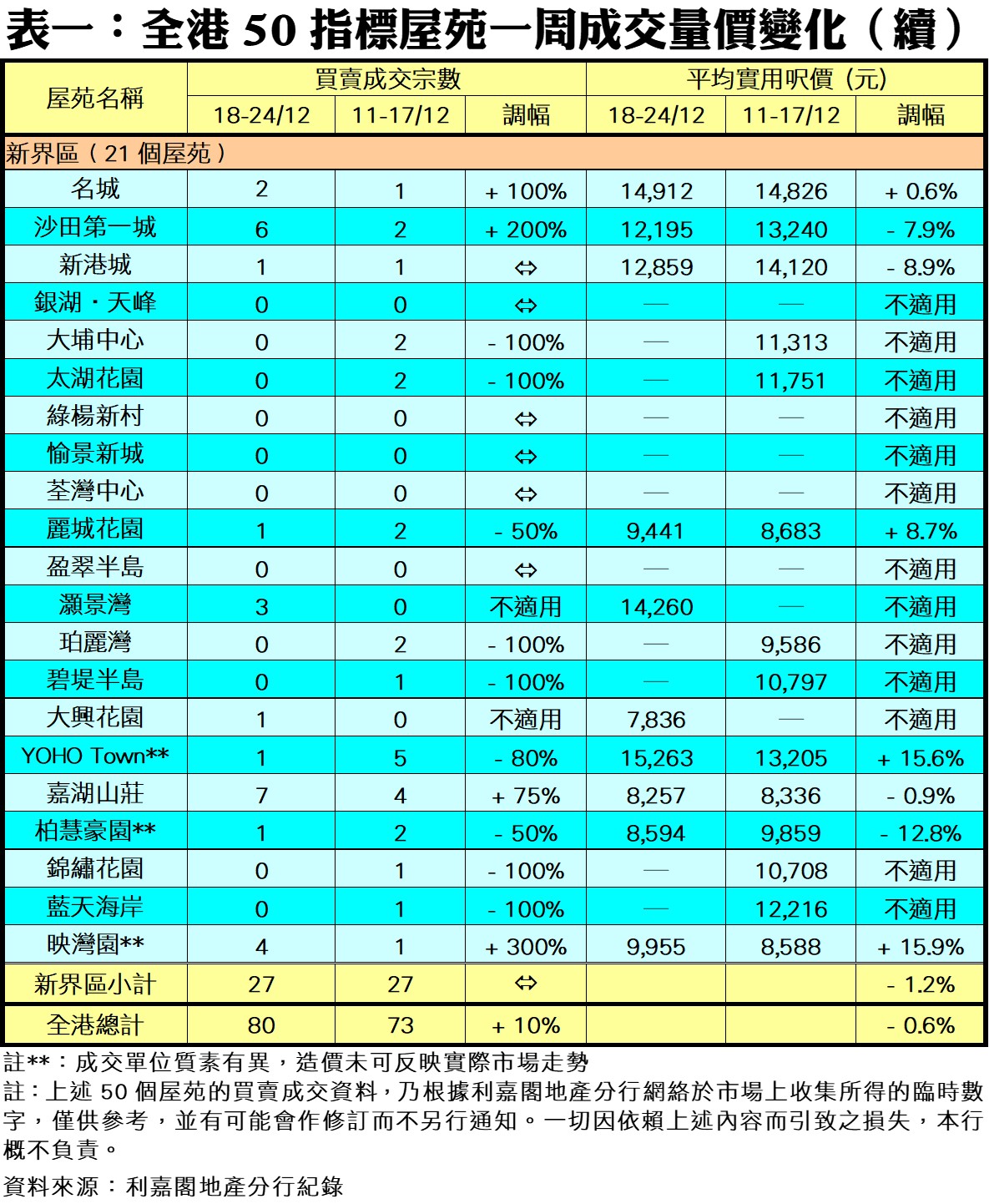 利嘉閣地產研究部主管陳海潮表示,臨近年底利好樓市的消息增多,而二手市場趁一手全新盤的推盤空窗期吸納之前未能成功揀選新樓的向隅客群,刺激二手交投藉機持續反彈。綜合利嘉閣地產分行數據所得,全港50個指標屋苑於上周(18/12—24/12)共錄80宗買賣個案,較前周(11/12—17/12)的73宗再增加10%,創自六月底以來的二十六周新高,亦是期內首度重回八十宗水平。