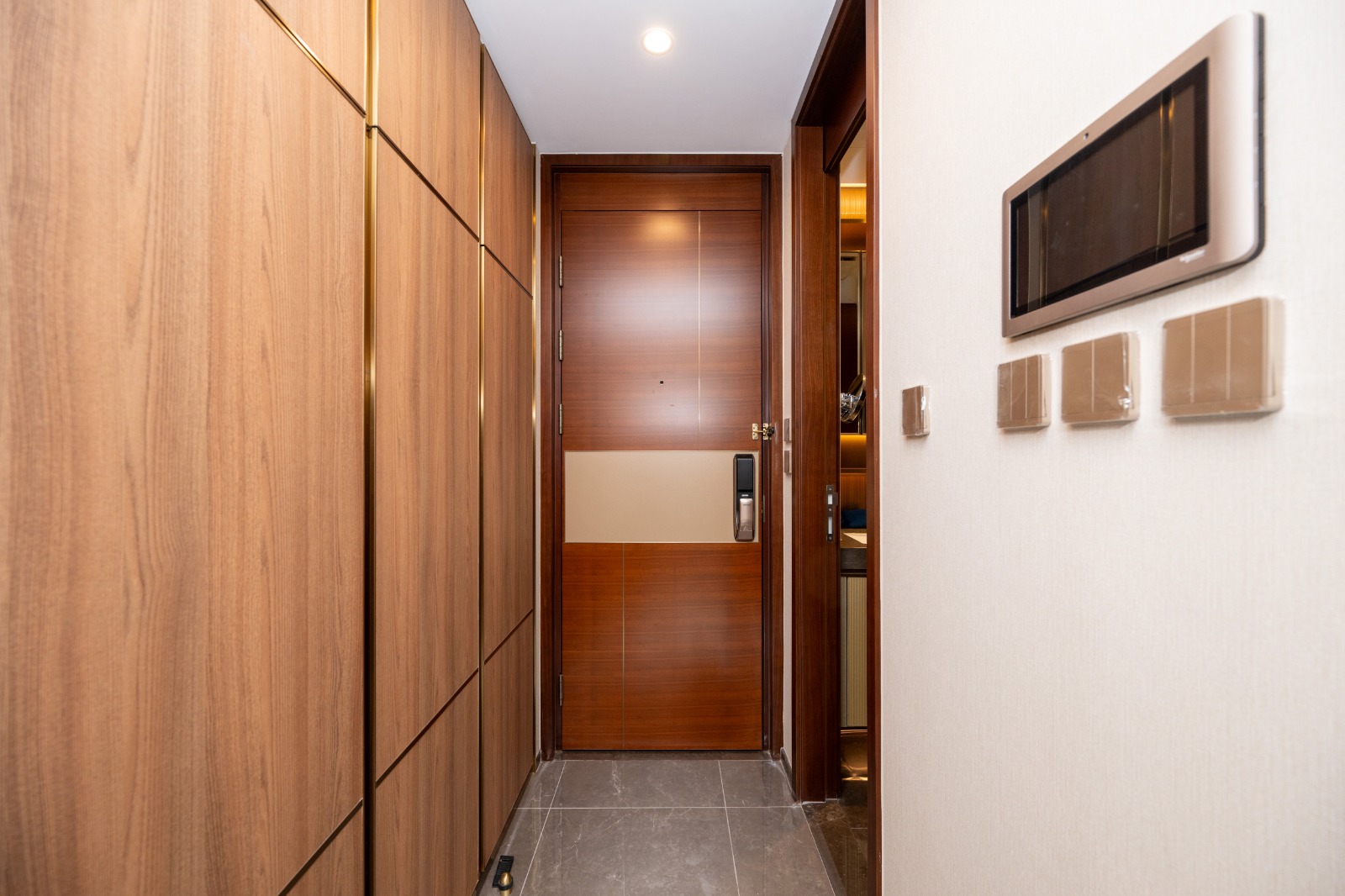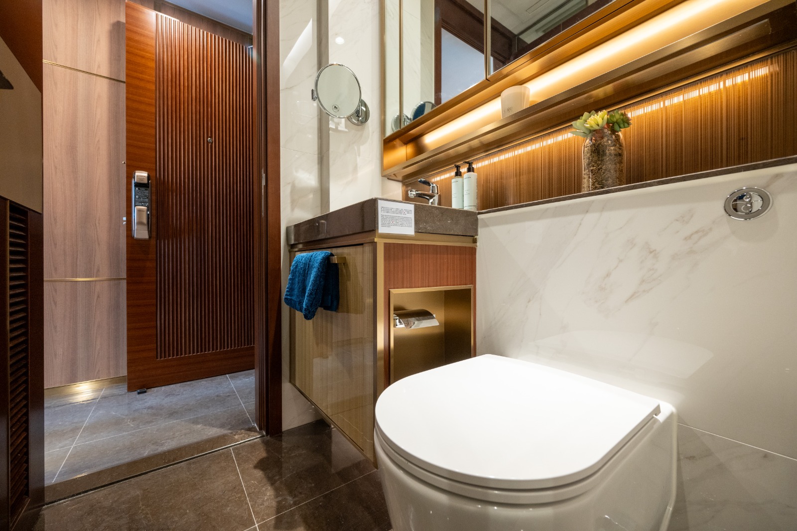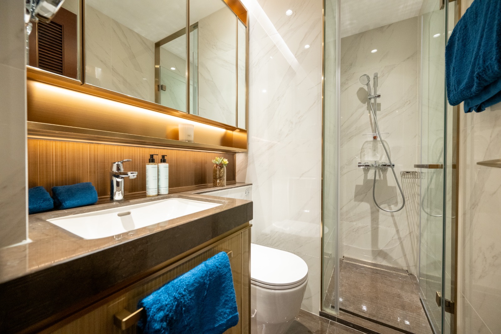 浴室位於入室左側,設計注重於自然材料和簡潔的線條,使用了大理石地板和牆面,配以型格櫥櫃和石材洗手台。浴室採乾濕分離設計,未設有窗戶,淋浴間以玻璃門分隔。