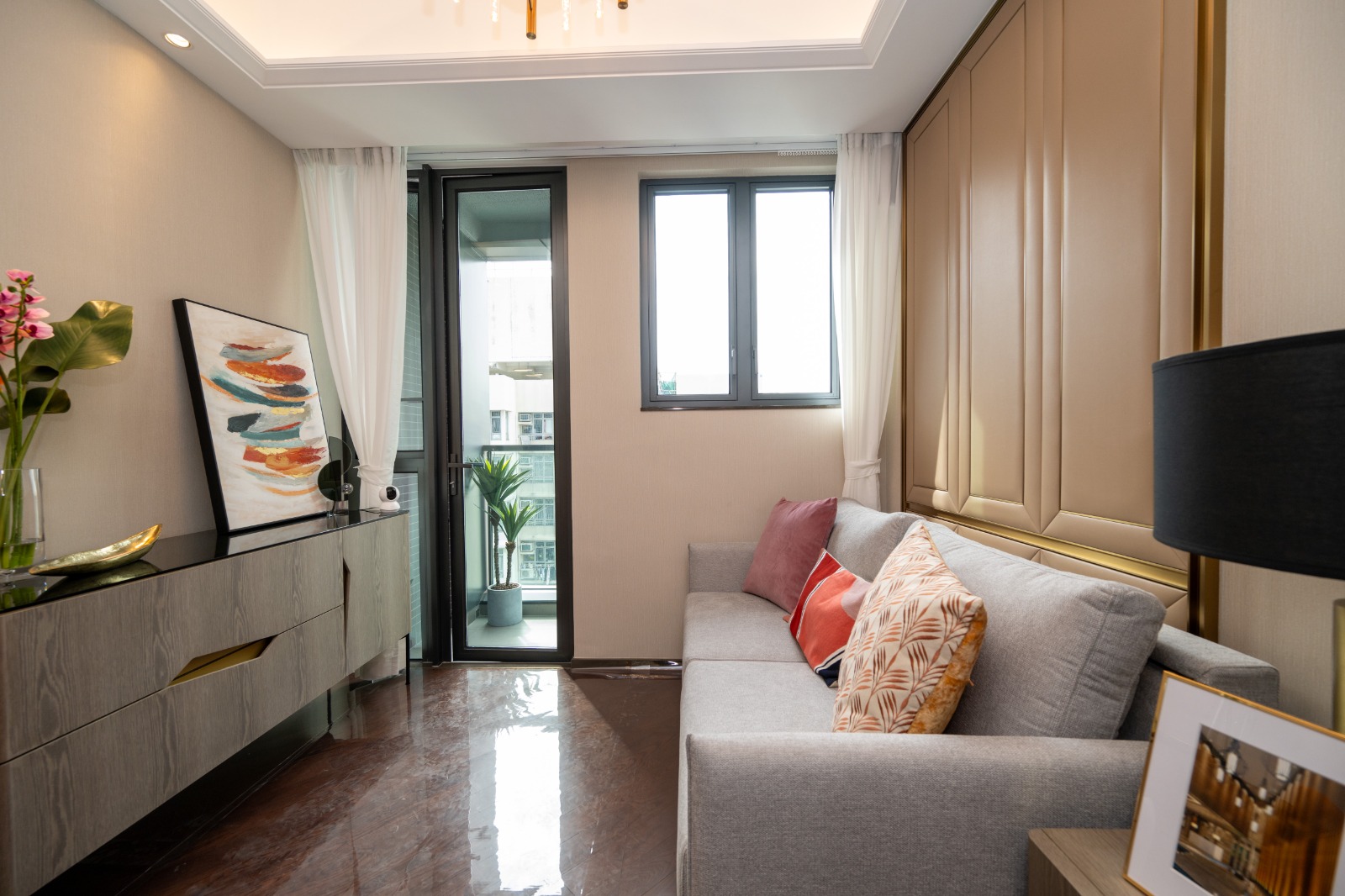 單位使用了大理石地板和木質元素,營造出高雅和自然的感覺。客廳主要以舒服的沙發床作為主體,設計選用了柔和色調及自然材料,如棉麻、亞麻布和輕薄的紗簾。設計形格的電視櫃加上中性的特色畫作及花卉配飾,讓自然氣息蔓衍在整個環境中,展現出既舒服又舒適的感覺和生活細節。沙發床旁邊搭配一盞時尚燈具及簡約時尚的掛衣架,讓空間物品擺設有高有低更具層次感。