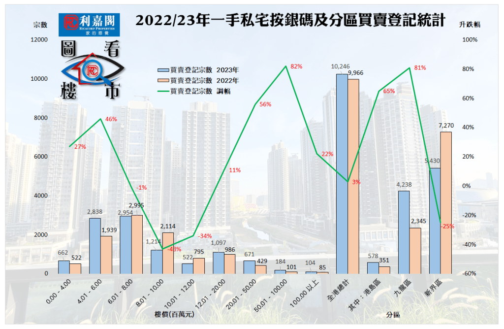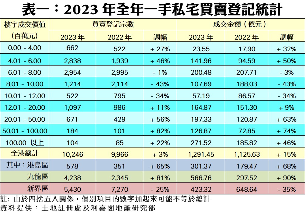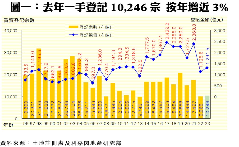 利嘉閣地產研究部主管陳海潮表示,受加息、股市下跌及經濟復甦較慢影響,2023年一手私宅買賣仍處低位徘徊,全年只錄微升;預期今年有較多潛在利好因素,利好買賣於低基數下有較顯著的反彈。根據利嘉閣地產研究部綜合土地註冊處數據,2023年全港共錄一手私宅買賣登記10,246宗,較2022年的9,966宗微升3%,雖止住跌勢,但仍為1996年有紀錄以來的歷史第4低年度。期內成交總值錄得1,291.45億元,雖按年增15%,但亦為近10年來的次低水平;而去年每宗一手私宅登記平均售價約1,260.45萬元,按年升11.6%,但較2018年歷史高峰的1,459.14萬元則少13.6%。