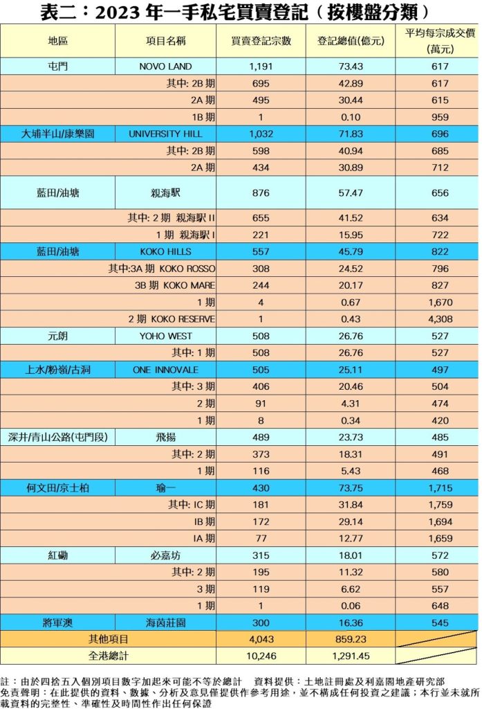 按樓盤分類,2023年熱賣樓盤之首為NOVO LAND 2B期錄得的695宗登記,其次為親海駅II的655宗,第三為UNIVERSITY HILL 2B期的598宗,再者是YOHO WEST 1期的508宗。至於登記排行榜內去年平均每宗成交價最高者是KOKO RESERVE的約4,308萬元,而較低平均價者為ONE INNOVALE 1期的約420萬元(見表二)。