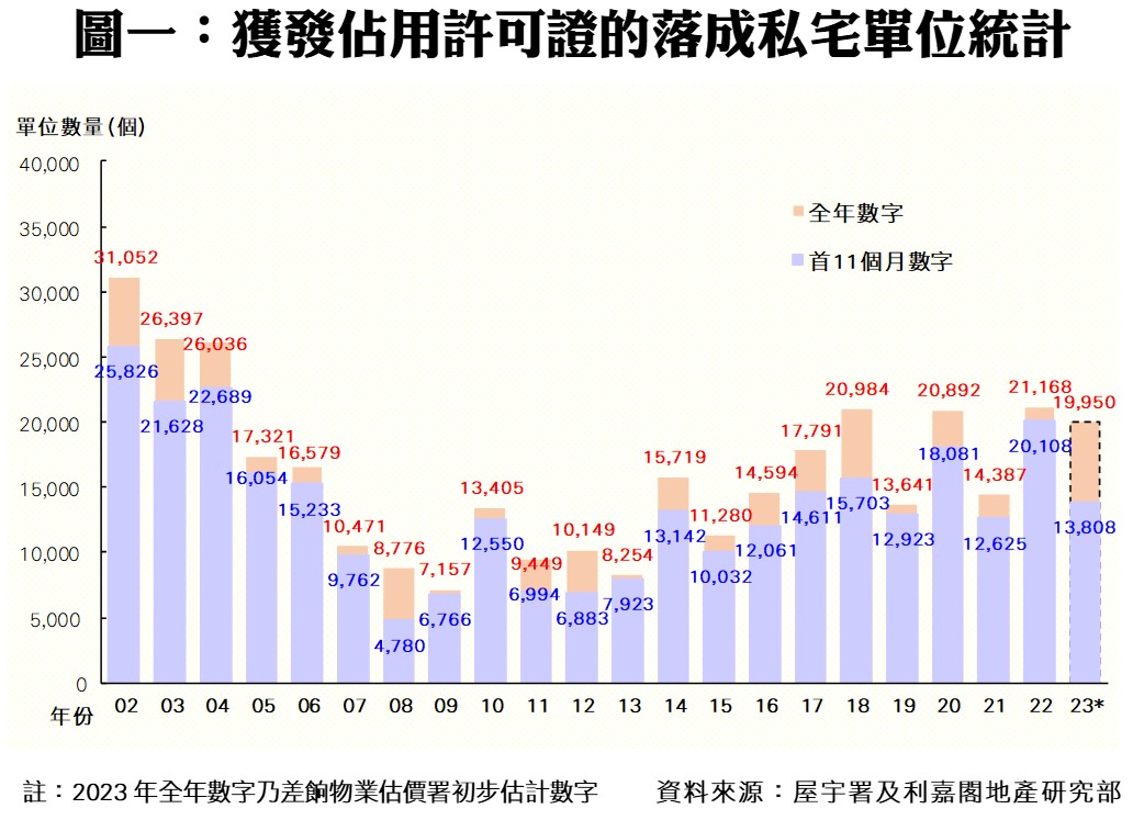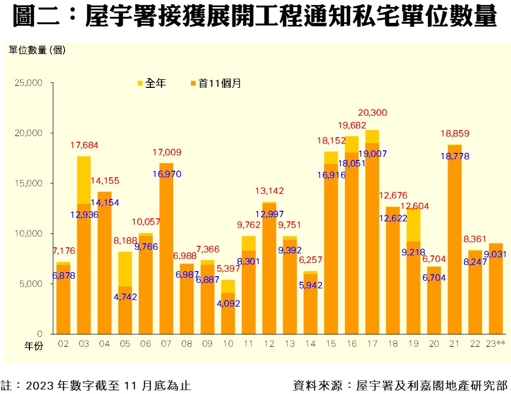 此外,私人住宅落成量方面,根據屋宇署今日最新發表的資料月報顯示,2023年十一月份全港共有7個項目,合共3,238個私人住宅單位落成(以屋宇署發出佔用許可證的樓宇數量為準),較十月份的480伙增加逾5.7倍,創二十二個單月新高;而今年首十一個月共有48個項目、涉及13,808伙私宅落成,佔差估署全年預測量約69%,較去年同期的20,108伙減少31%。