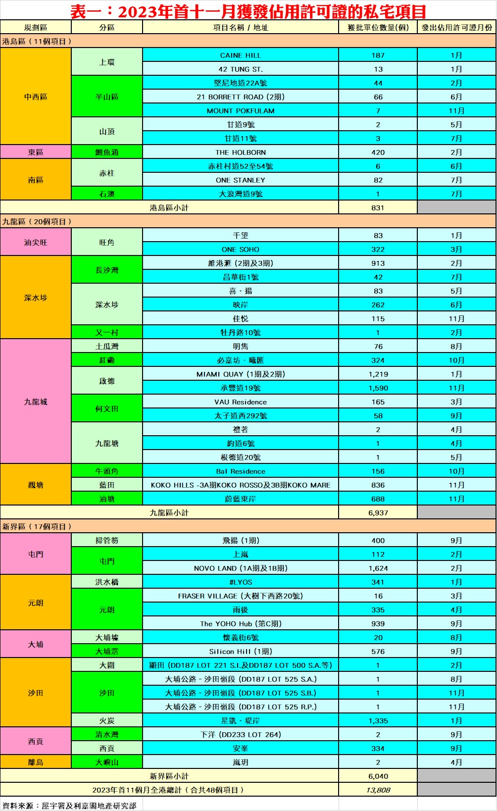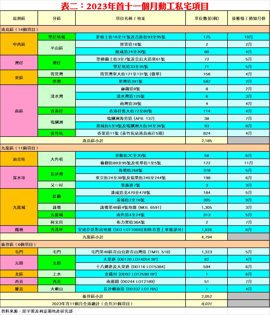 按地區劃分,今年首十一個月九龍區共有20個項目、合共6,937個單位落成,佔整體比例約50.2%;新界區共有17個項目落成,涉及單位總數6,040伙,佔同期整體私宅落成量近43.8%;港島區則有11個項目落成,涉及單位總數831伙,佔整體私宅落成量約6.0%。陳海潮指出,部分大型項目包括屯門「NOVO LAND」第2A期(929伙)、第2B期(729伙)及「凱和山」(698伙)或有機會於2023年底取得入伙紙,加上其他中小型項目,估計2023年全年落成量約1.55萬至1.6萬伙水平。