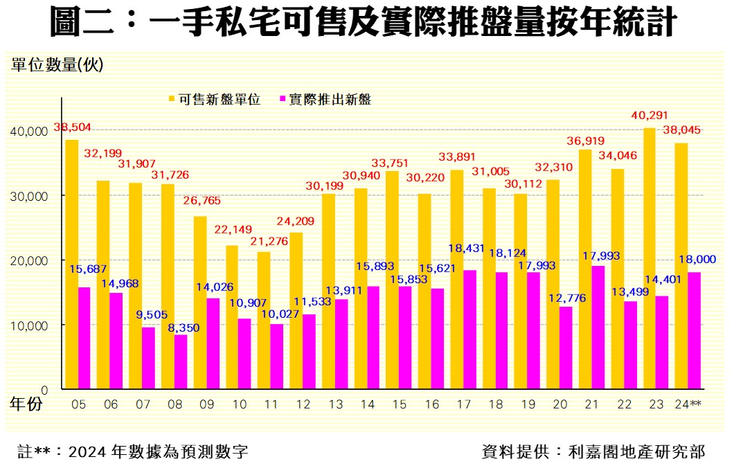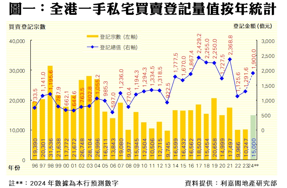 另外,放寬買家印花稅及為專才提供「先免後徵」安排,亦可刺激大量已到港的專才置業;而綜觀目前環境,發展商仍會以貼市價開盤,以吸納市場購買力,相信除了可帶動逾8萬新增到港的專才人口置業外,本地之前被扣起的購買力亦將回流,可推動今年一手新盤交投量在去年的低基數下大升。陳氏初步預期,2024年一手私宅買賣登記量可較去年增逾四成,至約1.5萬宗水平,而登記金額亦料相應增加47%,上試約1,900億元。