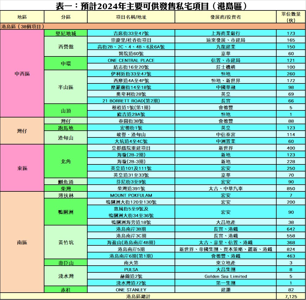 至於港島區方面,2024年有38個潛在項目備馬上陣,項目量為全港三大區中次多,惟單位總數只有7,125個,則為三區中最少。今年港島最大的供應庫仍然是來自南區的3,289伙(佔港島整體46.2%),焦點為黃竹坑站上蓋港島南岸,其中項目第5期為區內最大單一新盤,提供824伙,而整個黃竹坑站年內料提供2,855伙潛在供應,已佔了全港島總供應四成。至於港島最大單一項目(以已知分拆期數後計)為柴灣道391號的850伙,而另一焦點則為北角皇都戲院重建項目的400伙。此外,值得一提的是,中西區是繼南區後,今年在港島項目選擇次多的分區,合共有13個項目伺機開盤,當中涵蓋上至山頂的獨立屋、半山低密度豪宅及中環、西環單幢物業等,各式選擇迎合不同需要﹙見表一﹚。