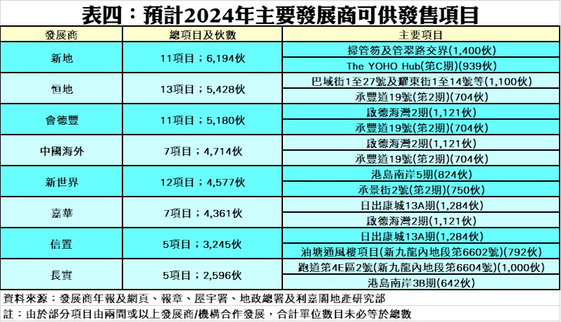 從發展商層面統計,新地2024年共有11個項目合計6,194個單位,成為今年潛在伙數供應最多的發展商,當中大部分(4,719伙)更屬獨資項目(包括港鐵項目),成為今年實際的潛在推盤王。至於總伙數次多的恒地共有5,428伙,惟當中若以獨資項目計算,則只有約2,161伙,佔比近40%。至於其他潛在新盤伙數較多的發展商包括如會德豐有5,180伙、中國海外有4,714伙、新世界有4,577伙、嘉華有4,361伙、信置有3,245伙,而長實則有2,596伙等(見表四)。