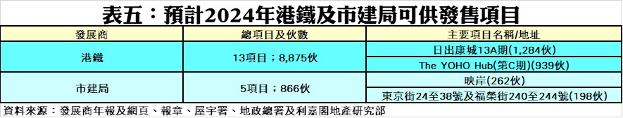半官方機構港鐵於2024年將有6個鐵路站沿線上蓋涉及13個項目、合共提供8,875伙,包括位於黃竹坑站港島南岸第3B至第6期5個項目共2,855伙;日出康城的12A期至13A期3個項目共2,619伙;何文田站IIA及IIB期共990伙;元朗站YOHO Hub第C期的939伙;油塘站通風樓項目有792伙及錦上路站柏瓏III的680伙,合計跑贏其他發展商成為今年新盤供應的最大源頭。此外,市區重建步伐持續,公營機構市建局2024年料有5個成熟項目有機會登場,涉及單位總數866伙,當中較大規模者為深水埗映岸提供的262伙及長沙灣東京街28號的198伙等﹙見表五﹚。