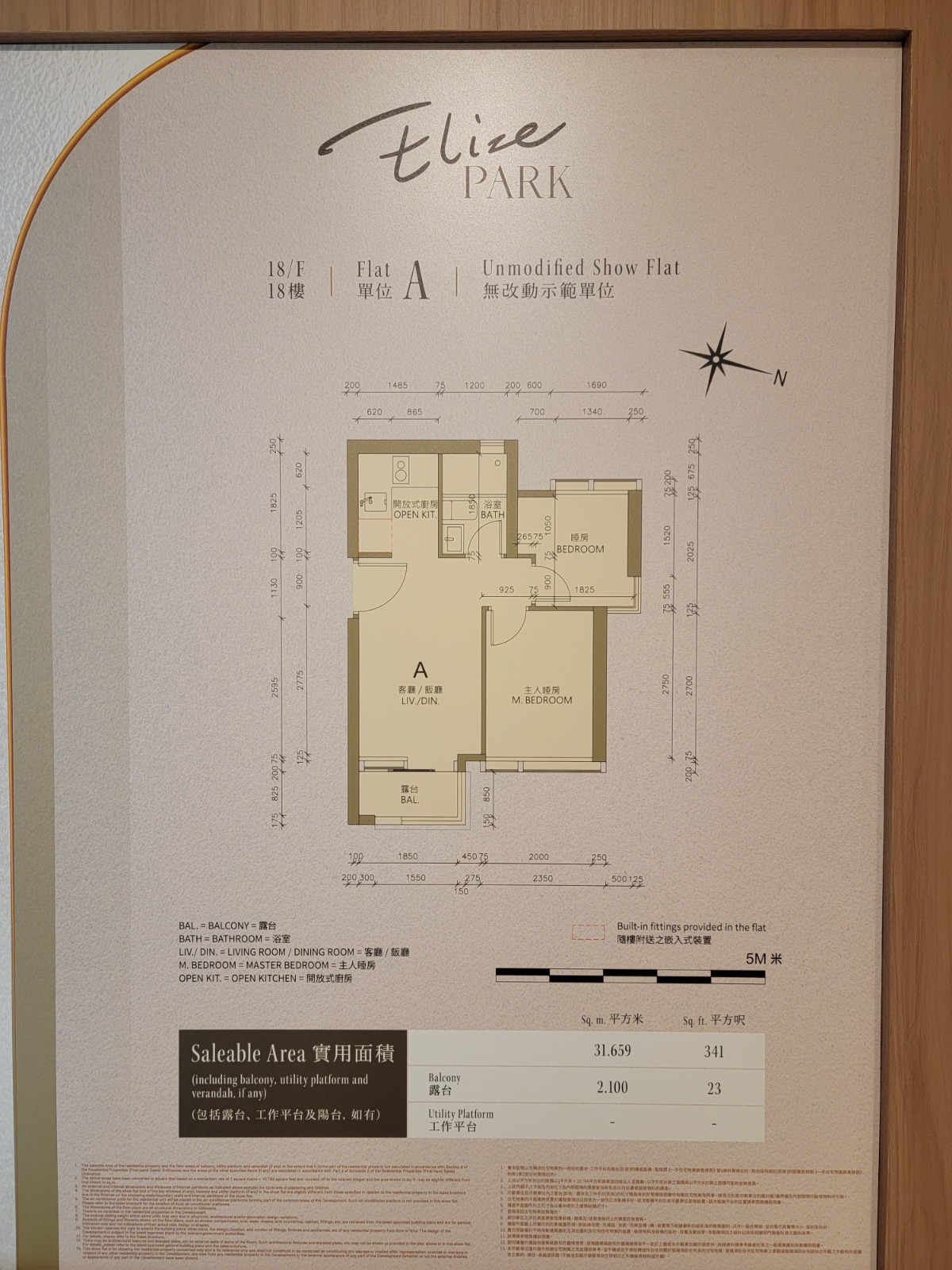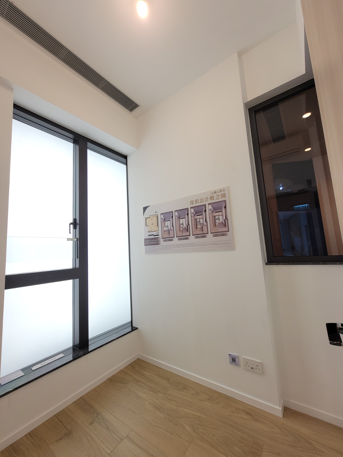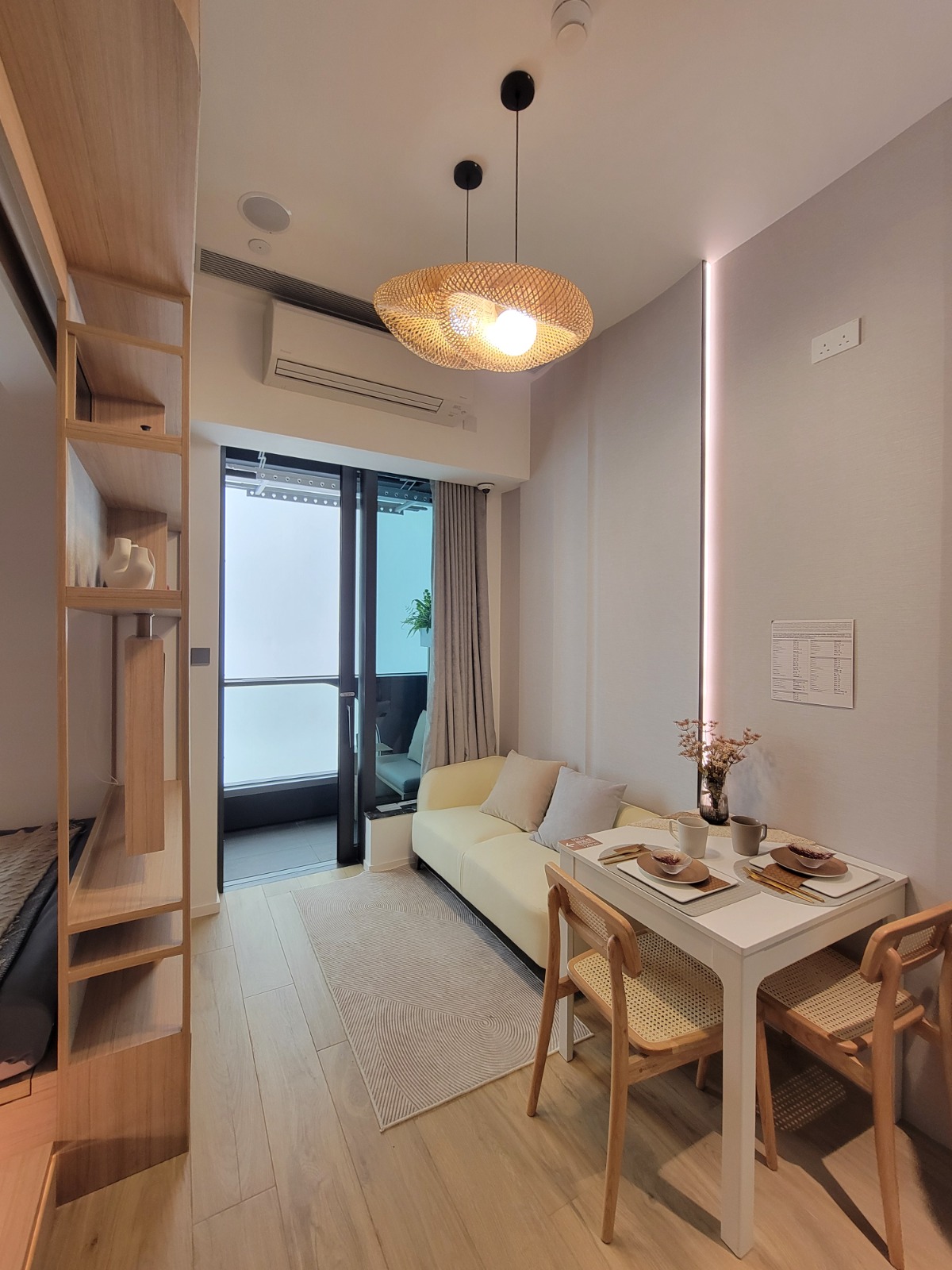 以18樓A室為藍本搭建的無改動示範單位,實用面積341方呎,兩房間隔。客飯廳以長形開則,寬敞實用,客飯廳間隔分明,地面鋪設意大利品牌木紋磚,配襯米白色牆身。客廳連接約23方呎露台,配以落地玻璃趟門,提升室內採光。單位配置Daikin分體式變頻冷暖冷氣機,透過智能偵測,自動調節空內溫度。