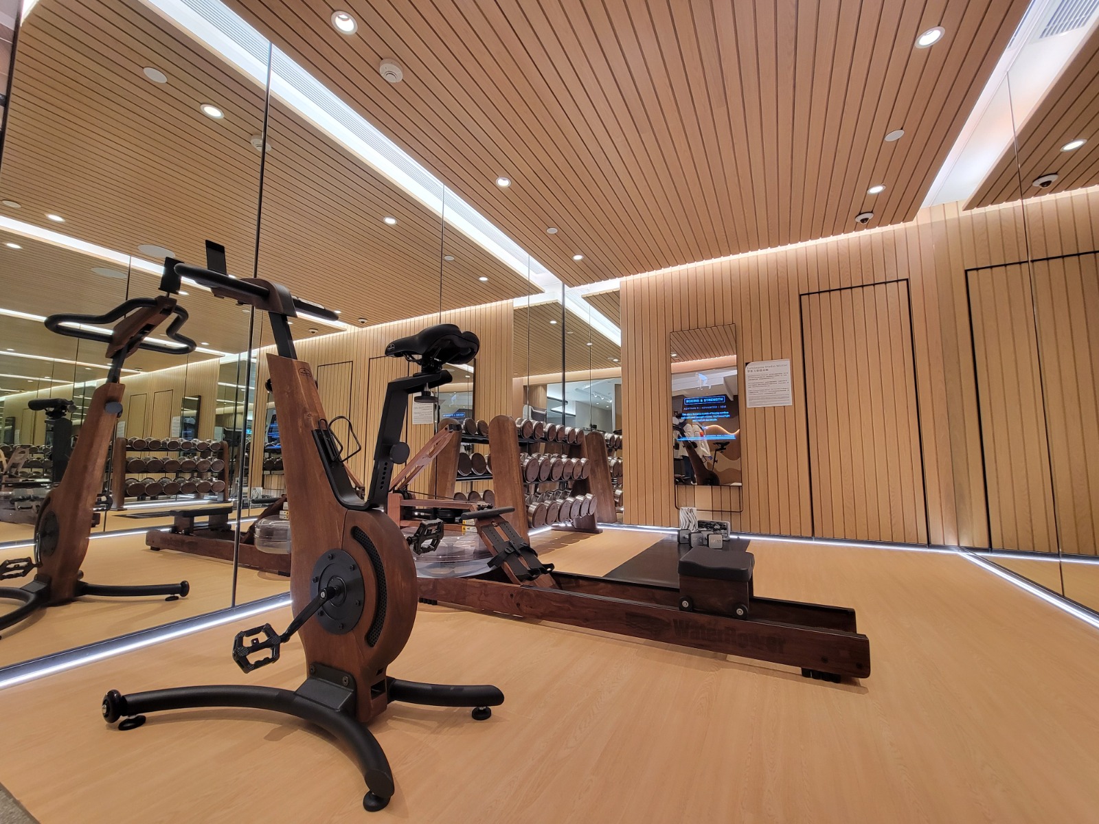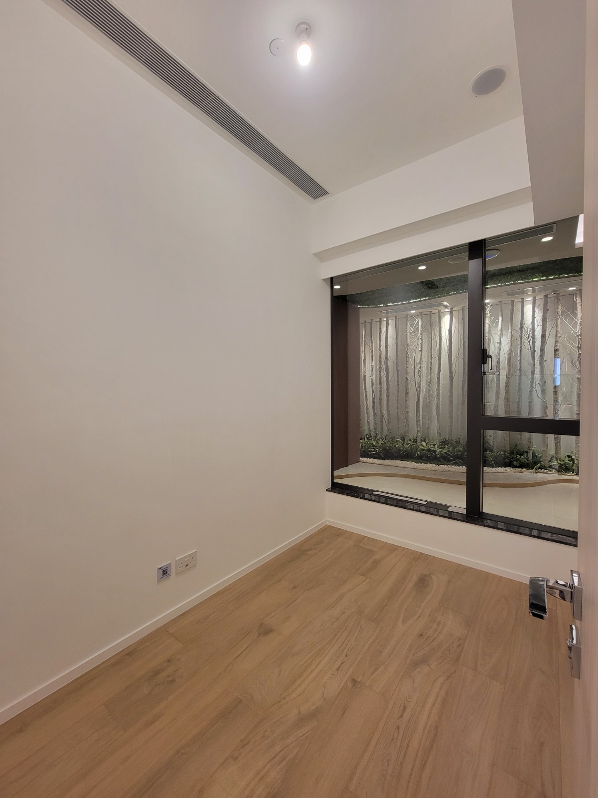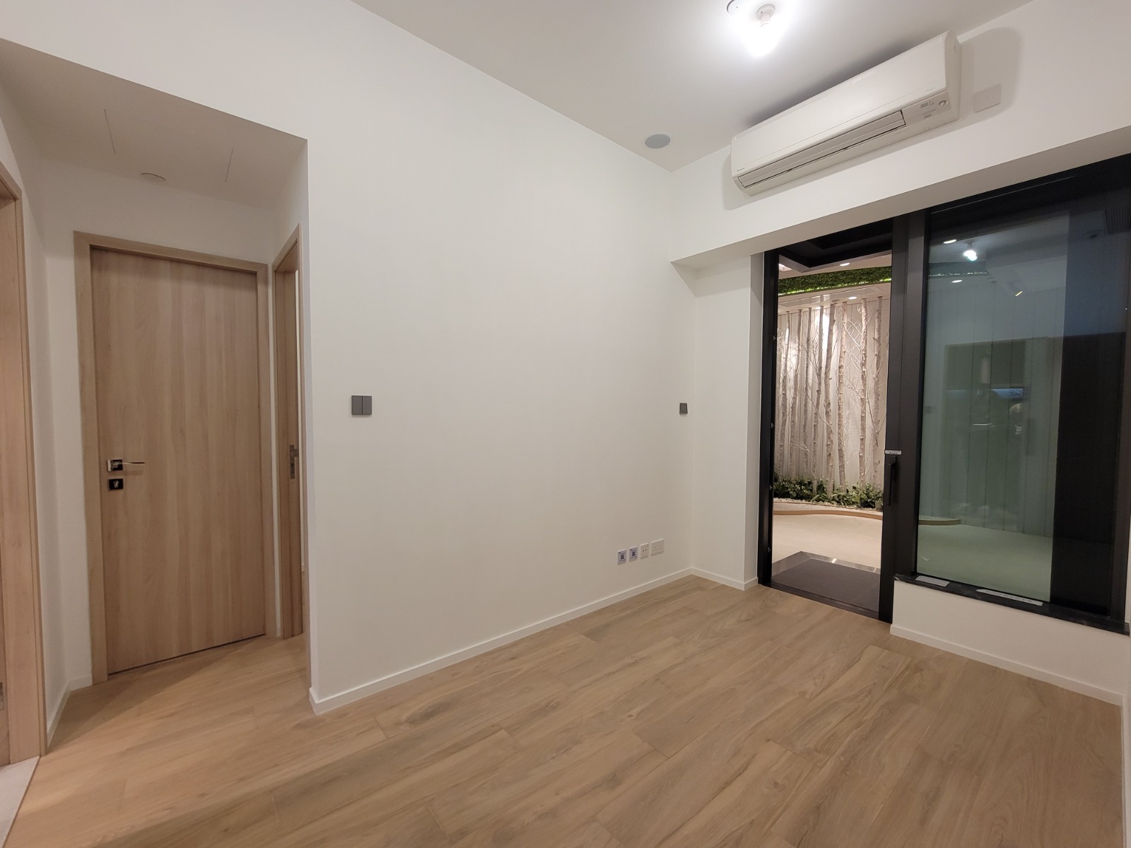 以18樓A室為藍本搭建的無改動示範單位,實用面積341方呎,兩房間隔。客飯廳以長形開則,寬敞實用,客飯廳間隔分明,地面鋪設意大利品牌木紋磚,配襯米白色牆身。客廳連接約23方呎露台,配以落地玻璃趟門,提升室內採光。單位配置Daikin分體式變頻冷暖冷氣機,透過智能偵測,自動調節空內溫度。