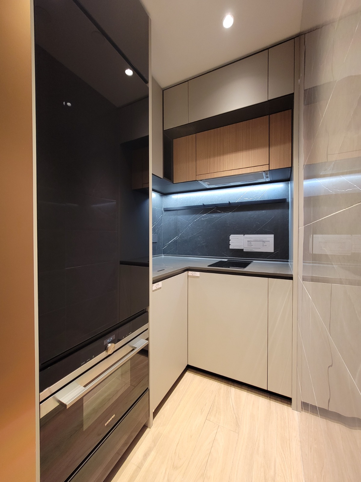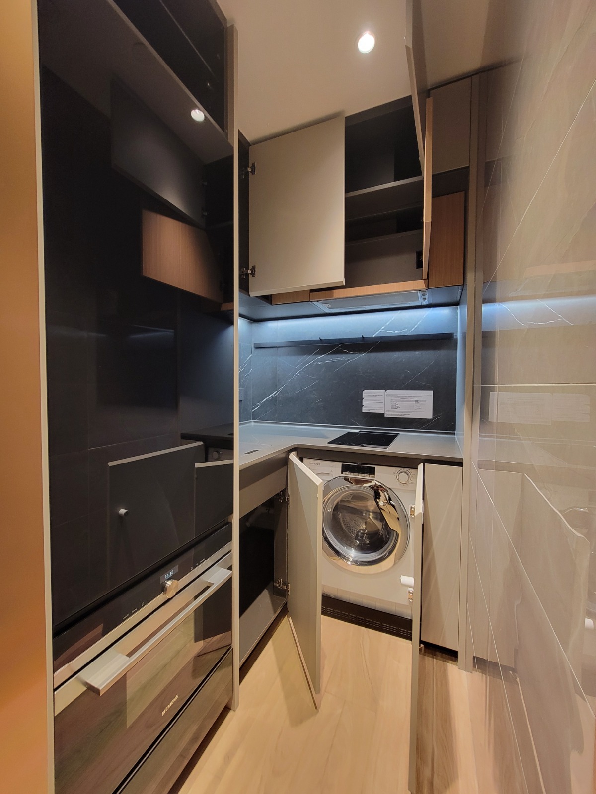廚房屬開放式設計,自成一個獨立空間,設有L型工作檯面,工作檯選用黑色石材,配合上層淺灰色拼原木色吊櫃。廚房配備多項品質卓著的嵌入式電器及爐具,包括德國西門子嵌入式電磁爐及嵌入式蒸爐、法國Rosieres雪櫃及洗衣乾衣機。